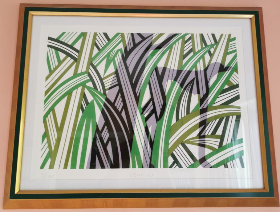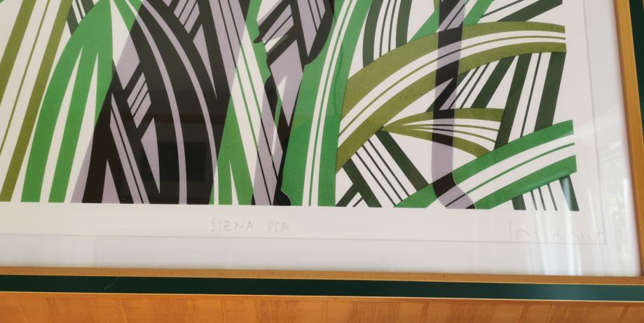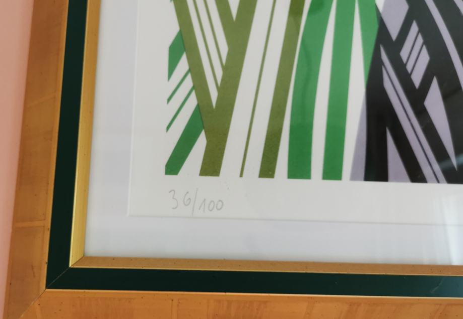 Uokvireno u prikladan okvir sa zelenom trakom (u skladu sa temom), staklo obično.