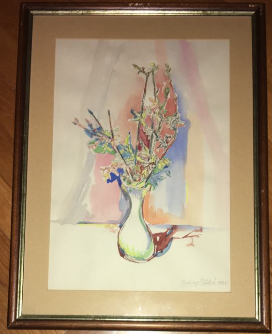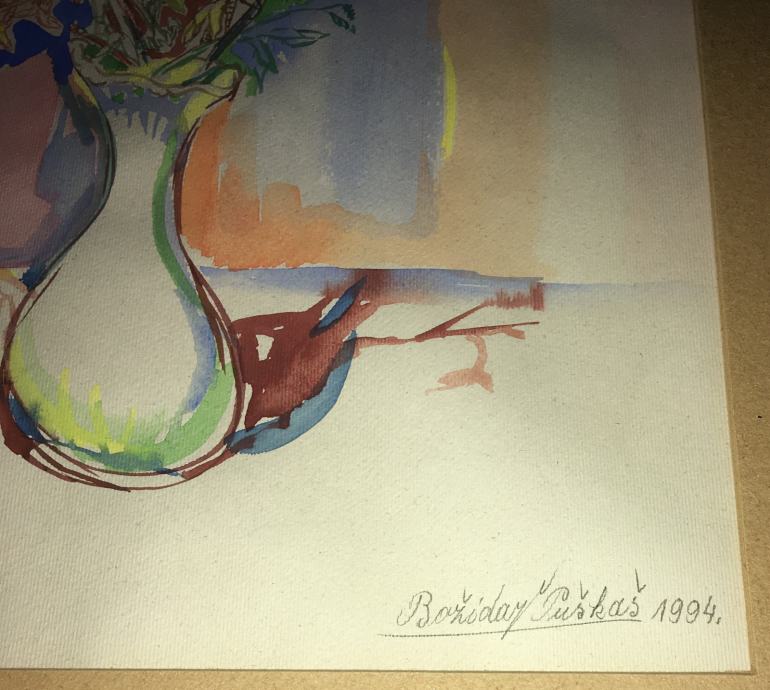 Akvarel s motivom cvijeća akademskog slikara i profesora Božidara Puškaša. Uokvireno i ostakljeno. Dimenzije s okvirom su 52x39cm (unutar paspartua 40x28cm).
