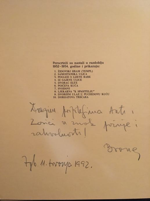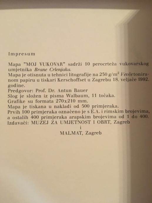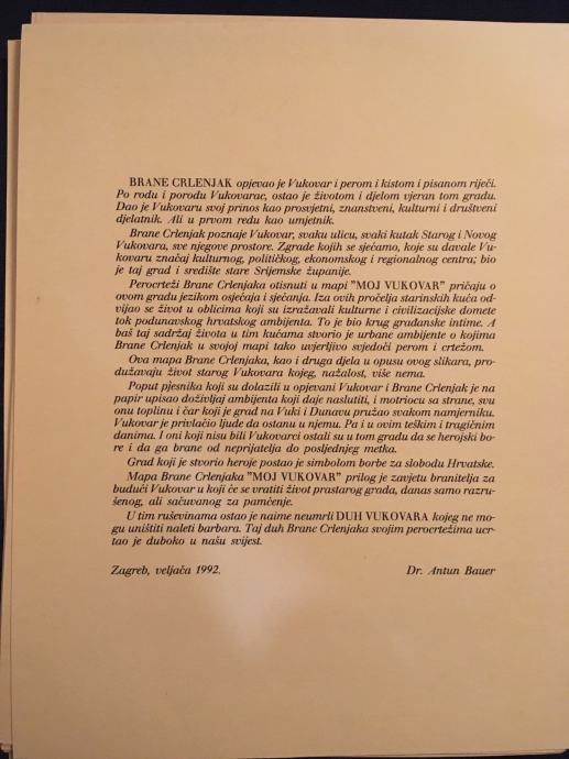 "Moj Vukovar" - mapa od 10 numeriranih i potpisanih grafika poznatog vukovarskog srednjoškolskog profesora umjetnosti, kipara (posebice medaljara), autora mnogih spomenika, slikara i kroničara starog Vukovara. Perocrteži po kojima su izrađene grafike su nastali u razdoblju 1952-1954.g., a mapa je izdana 1992.g. Dimenzije mape su 28x21,5cm.