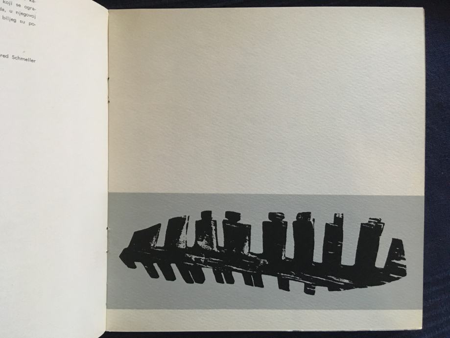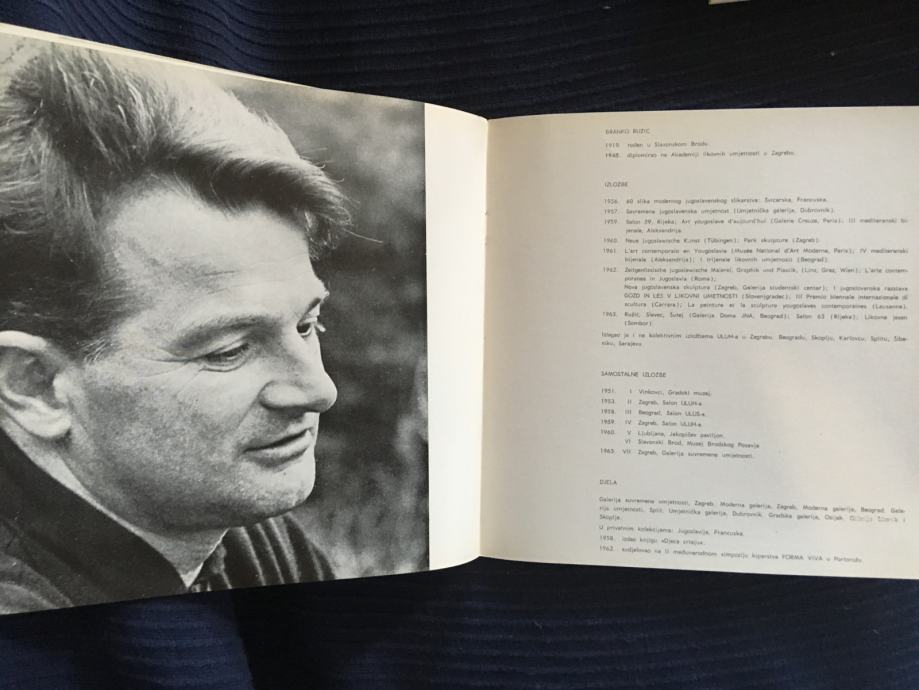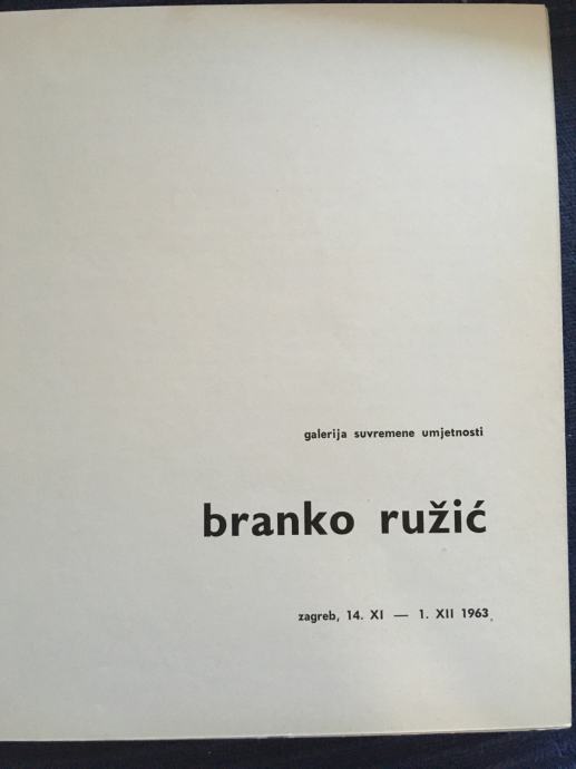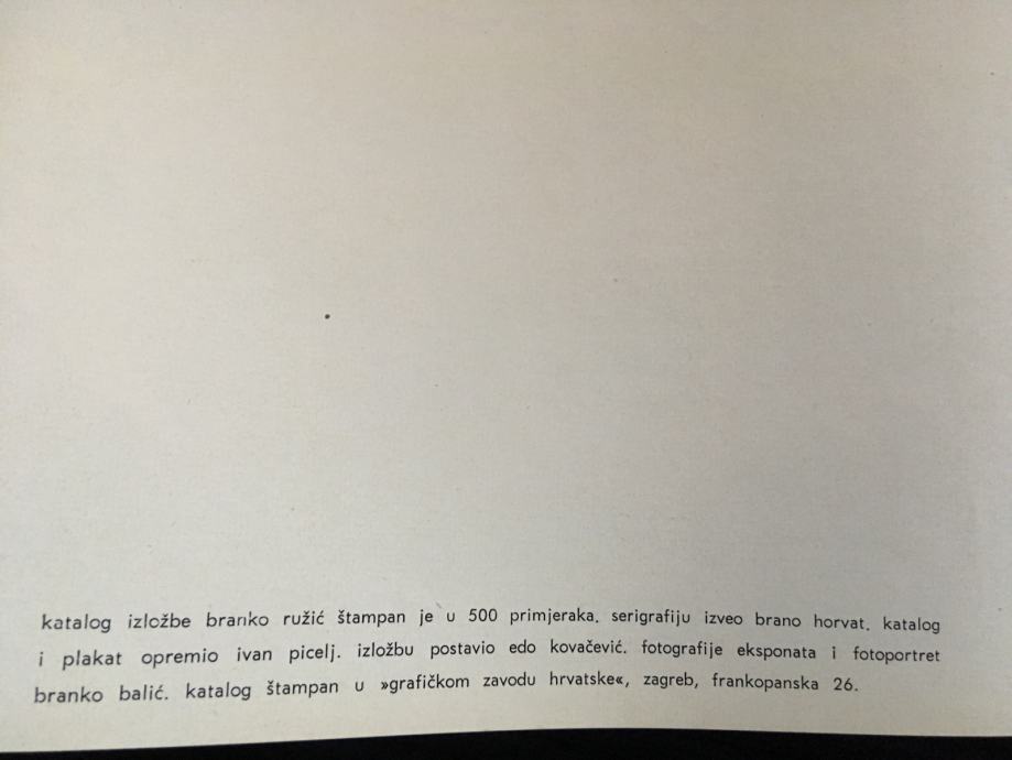 Nepotpisana originalna serigrafija poznaog hrvatskog akademskog kipara i sikara Branka Ružića, koja je bila dio kataloga izložbe održane u Galeriji suvremene umjetnosti u Zagrebu, 1963.g. Katalog je izdan u 500 primjeraka (tiskan u Grafičkom zavodu Hrvatske), a serigrafija je rađena u čuvenom studiju Brane Horvata, u kojemu su svoje grafike radili gotovo svi najznačajniji hrvatski umjetnici druge polovice 20. stoljeća. Dimenzije serigrafije su cca 21x20cm.