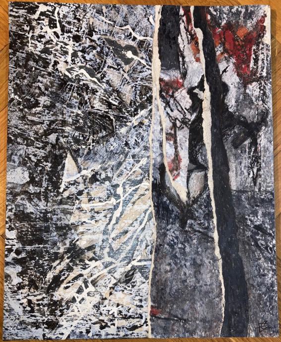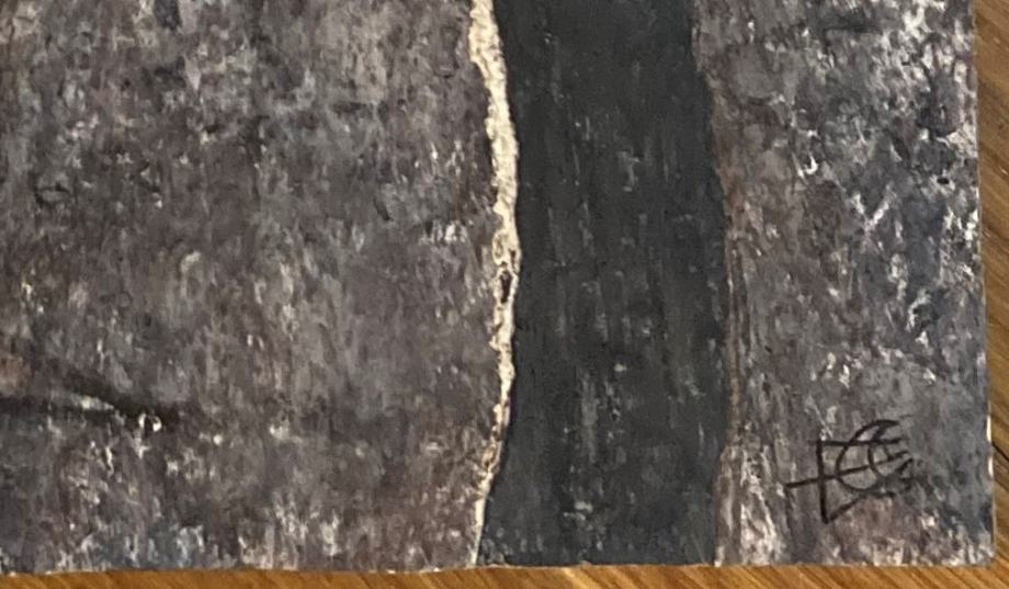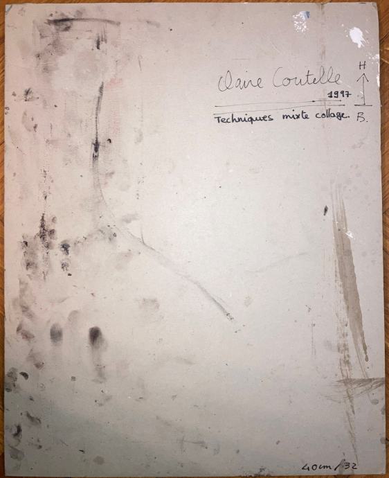 Ulje / kolaž na kartonu iz 1997. poznate francuske slikarice (Pariz). Dimenzije 40x32cm. Apstrakcija.