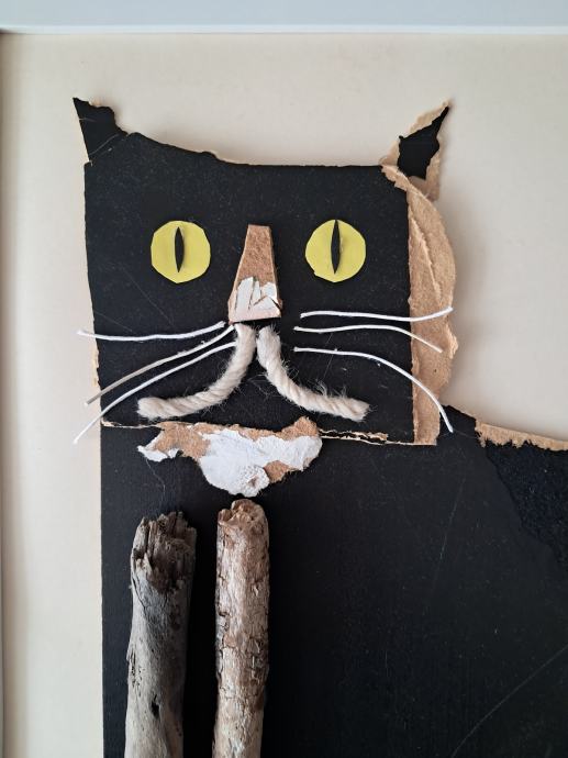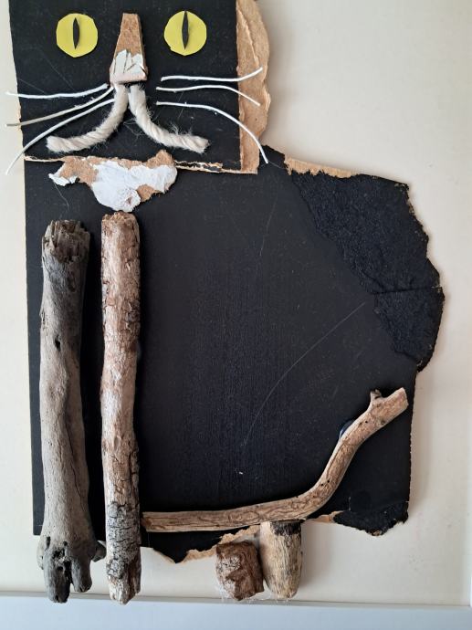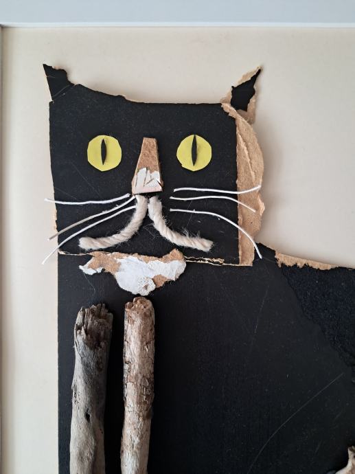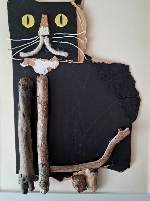 Ova simpatična slika izrađena je od naplavina i raznih dodataka. Komponiranjem je nastao ovaj crni mačak.Dimenzija slike je 35 × 45 cm.