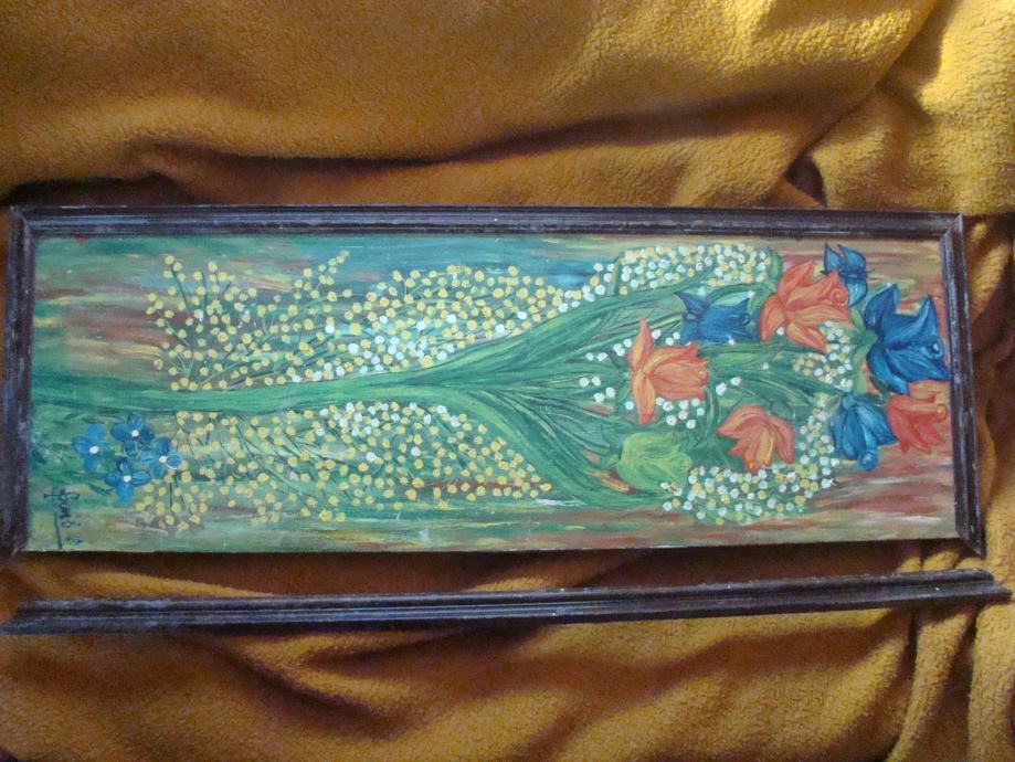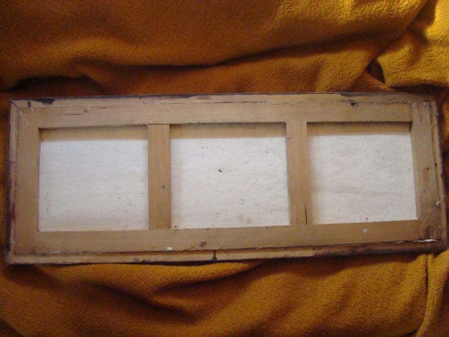 Slici je potrebno čiščenje, popravak i preuokvirenje. Sve vidljivo na slikama.94 x 35 cm ukupno