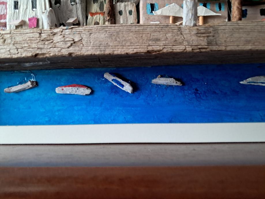 Ova lijepa slika izrađena je od morskih naplavina i obojana akrilnim bojama.Svaka riva priča svoju priču, pa neka ova ispriča vašu.Dimenzije slike su: 32 × 22 cm.