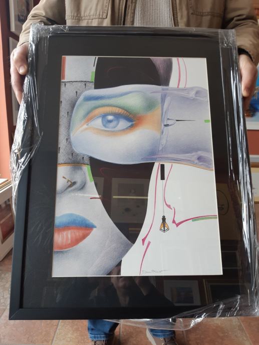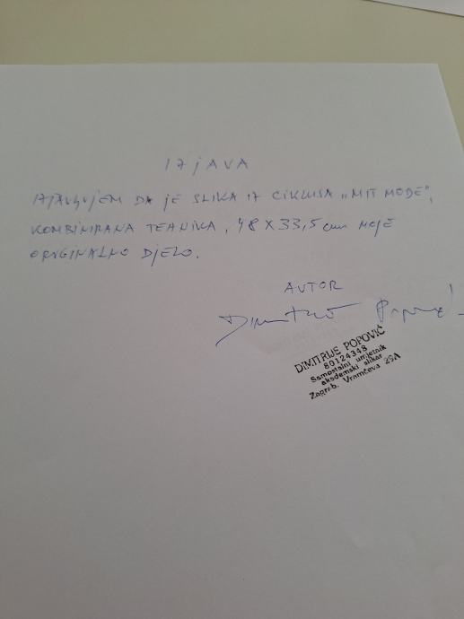 Kombinirana tehnika 48×33.5cm dolazi sa orginalnim certifikatom napisanim i potpisanim vlastoručno od strane autora sa pečatom. Mit mode je najnoviji ciklus Dimitrija Popovića a izložbu se moglo pogledati u galeriji bačva ( "Đžamija"). Sada odlazi za Milano...