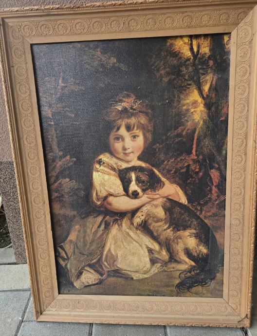 Prodajem dekorativnu sliku klasicnog motiva djevojcice s psom u bogatom ukrasenom okviru.Slika je radena u stilu 19.stoljeca , toplih tonova, idealna za dnevni boravak , hodnik ili rustikalni interijer.
