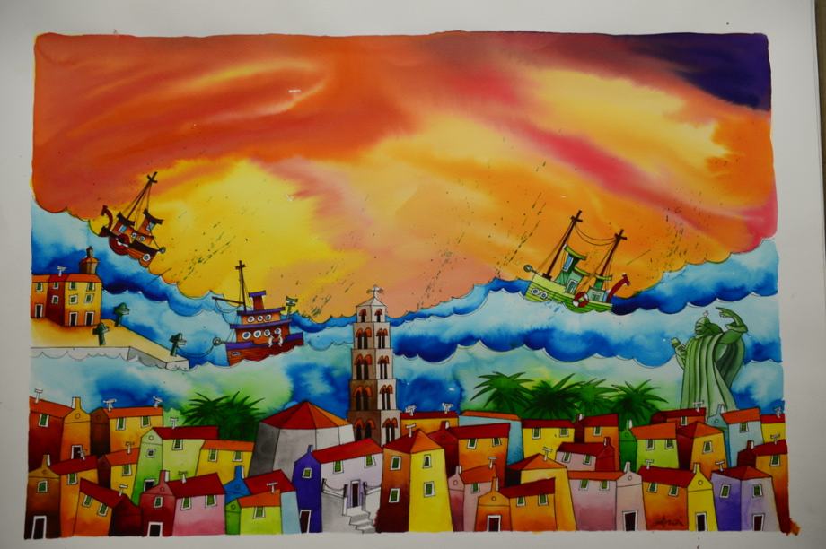 Riječ je o orginalnom akvarelu, i kod ovog autora oni imaju jednaku cijenu kao i ulja na platnu, cijena ovisi o količini detalja na slici i formatu, znači slika 35x50cm može koštati više od slike 70x50cm, odnosno veća može koštati manje, također cijena ovisi o uspjelosti akvarela, neki akvareli su slikani 8 sati, a neki 20 minuta, iz tog razloga se cijena uvelike razlikuje,. a cijene su u svakom slučaju jako prihvatljive.