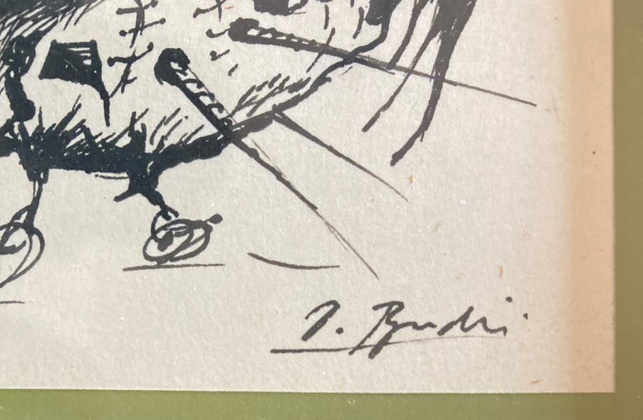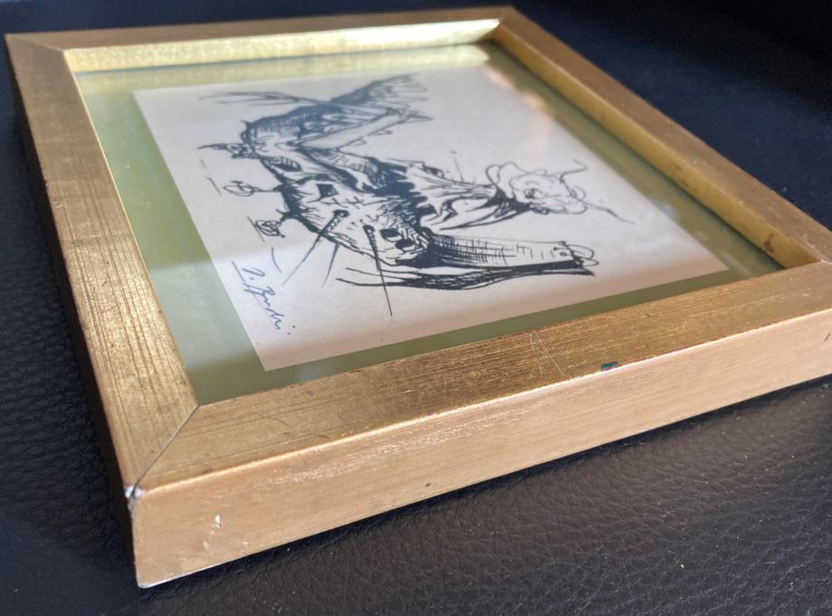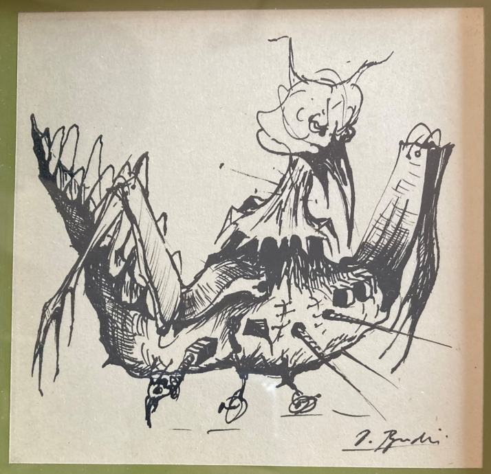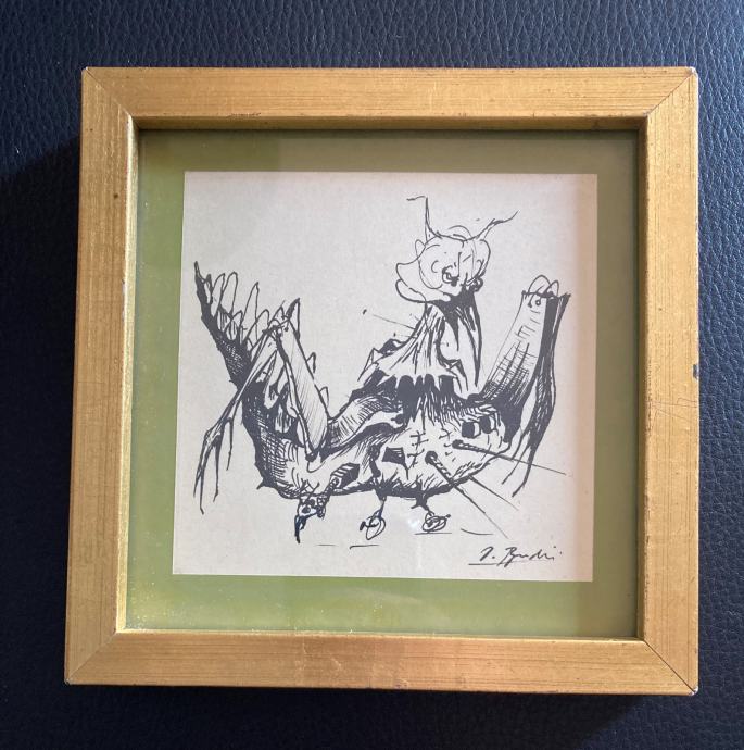 Crtež tušem poznatog hrvatskog slikara, Dubravka Budića. Kvalitetno uramljeno i ostakljeno. Dimenzije s okvirom cca 15x15cm.