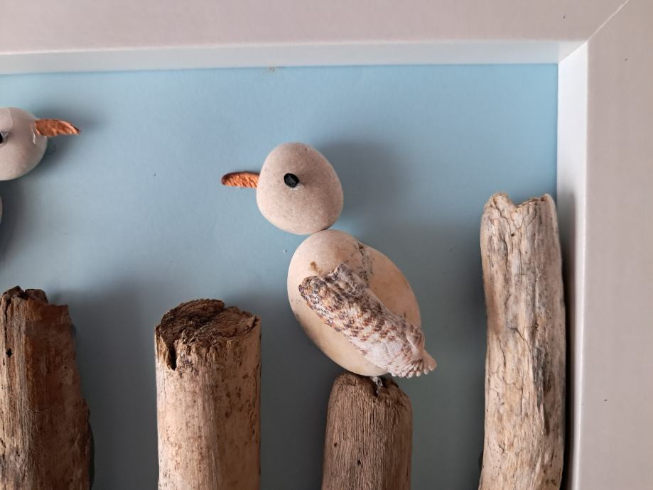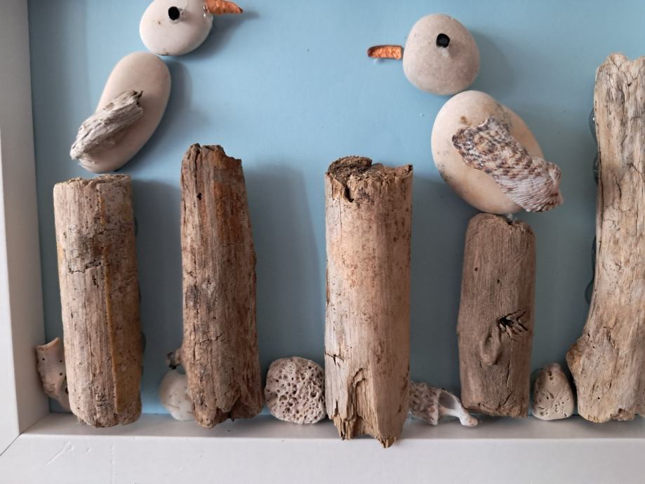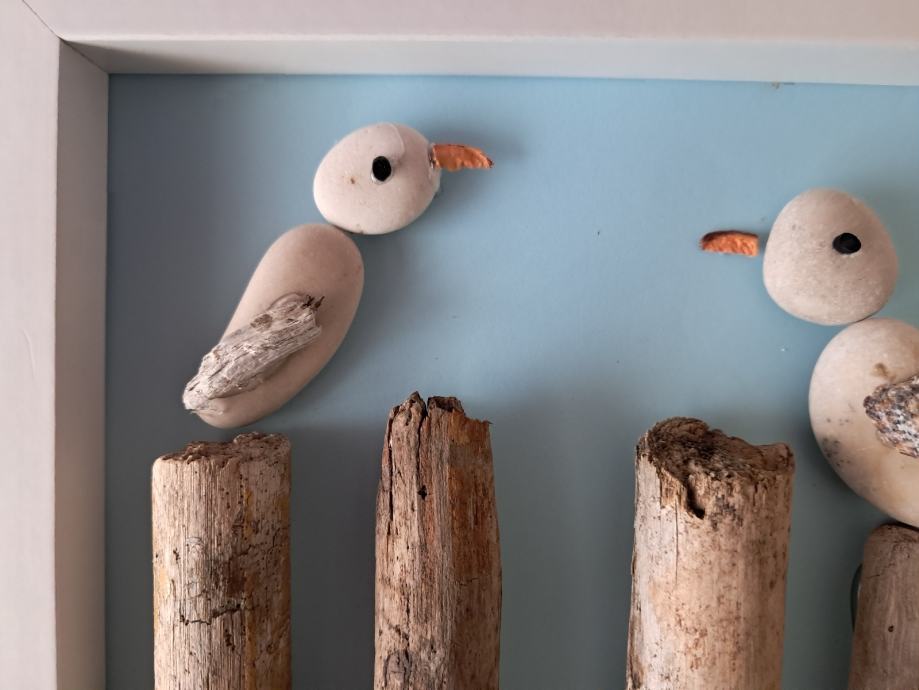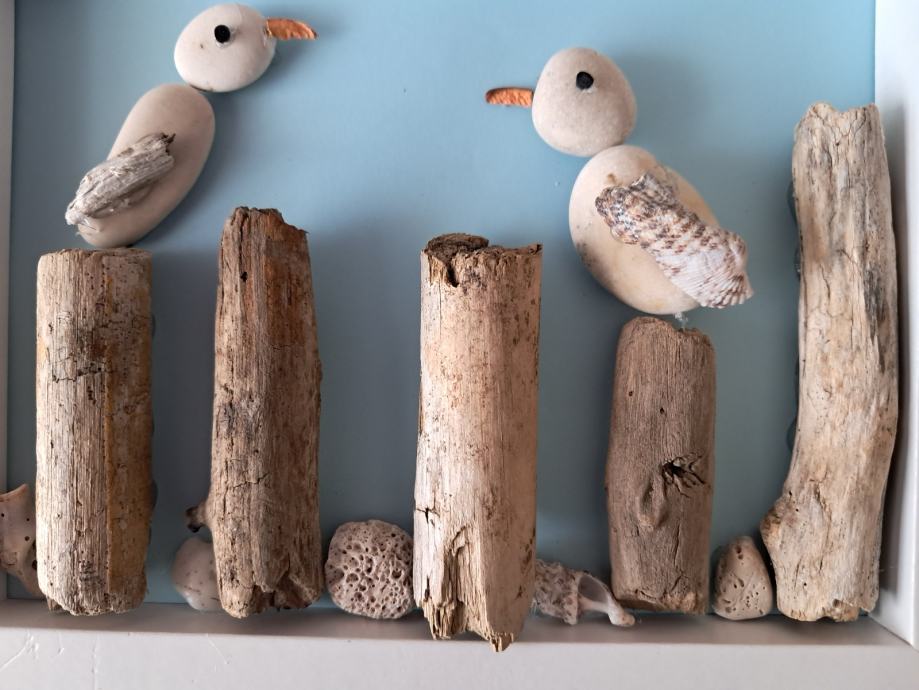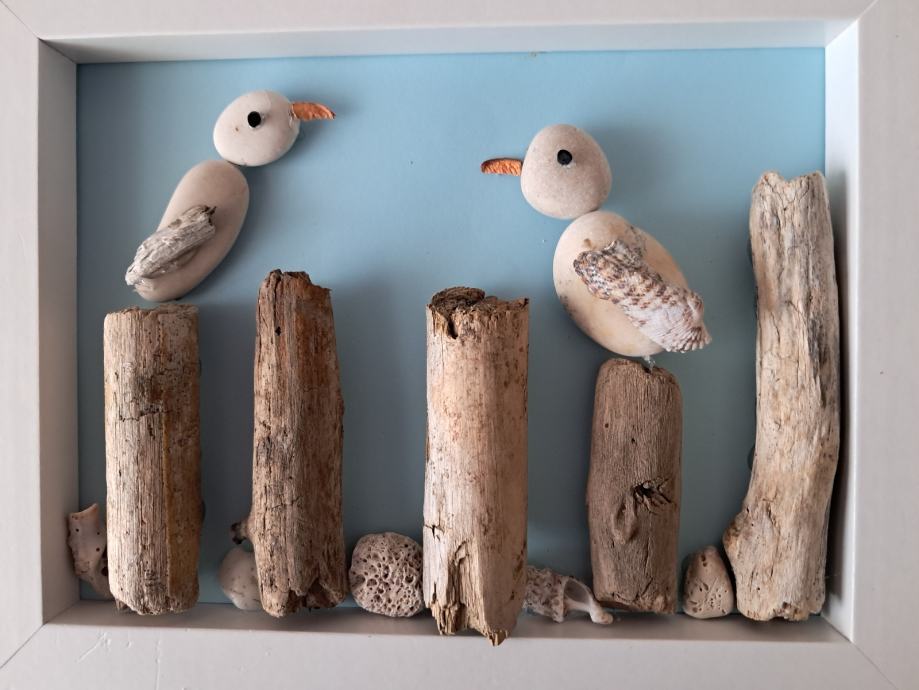 Ova simpatična slika izrađena je oc morskih naplavina i kamenčića.Prizor dva galeba na morskim stupićima uveseljava nas i sjeća na more.Dimenzija slike je 23×18 cm.