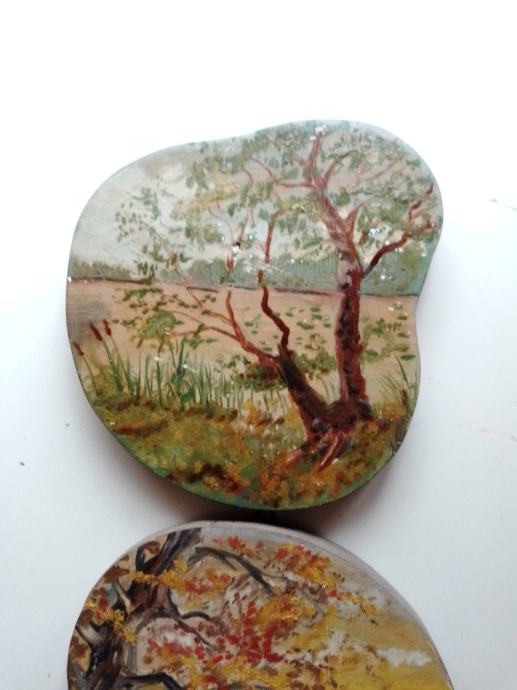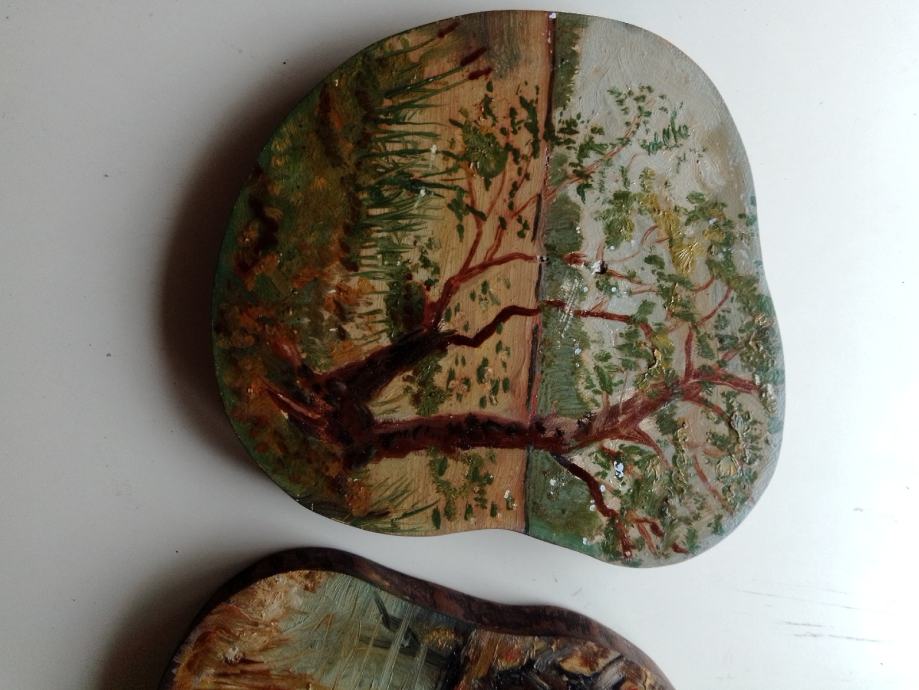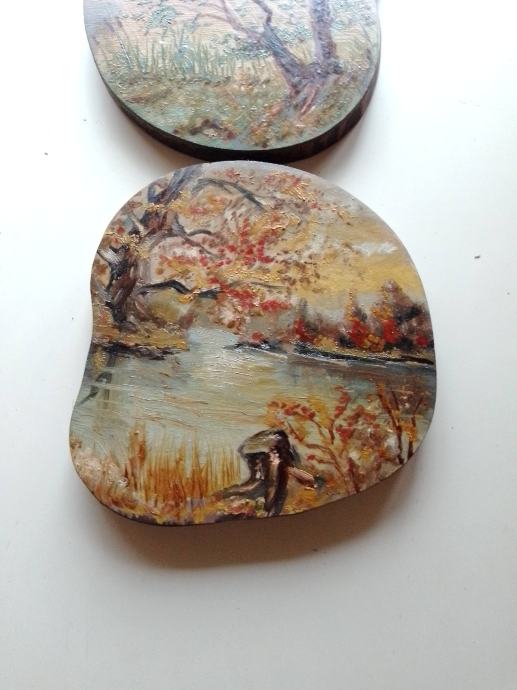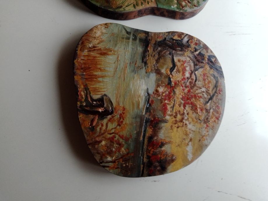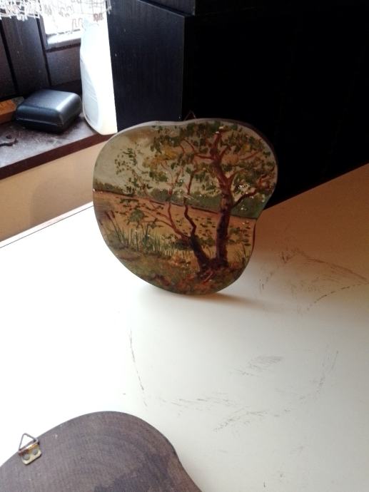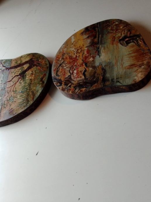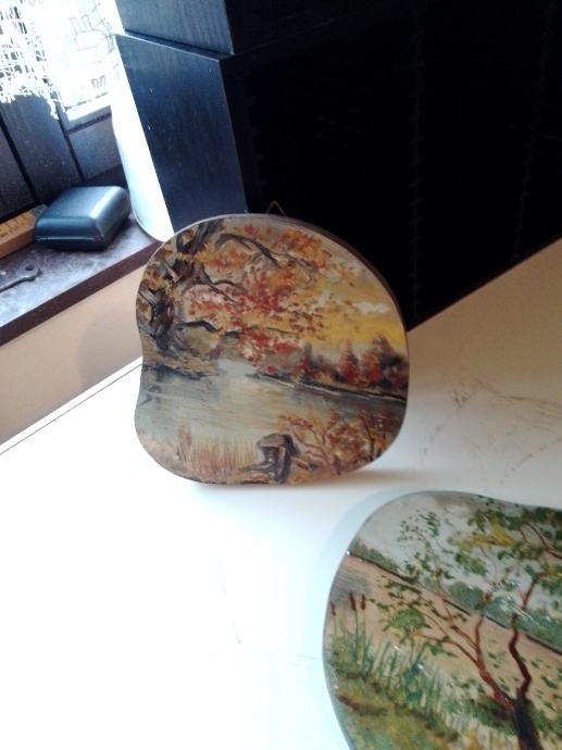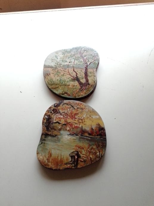 Fi 20x2cm dvije slike slikane uljem na drvetu.Tehnika popularna 50tih godina slikara amatera kao izražaj umjetničkog talenta Cijena za komad 20€ ,komplet 30 € .Šaljem poštom uplatom na moj tekući račun+ troškovi poštarine