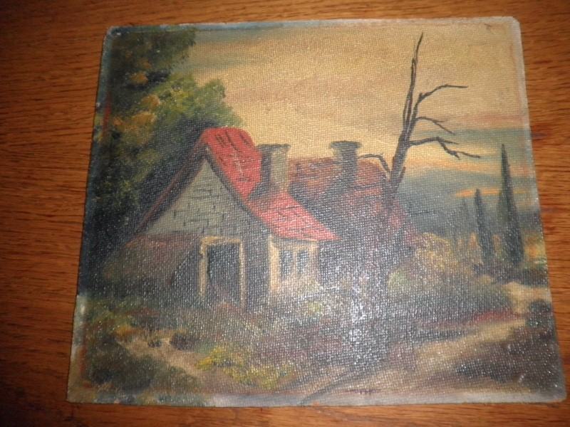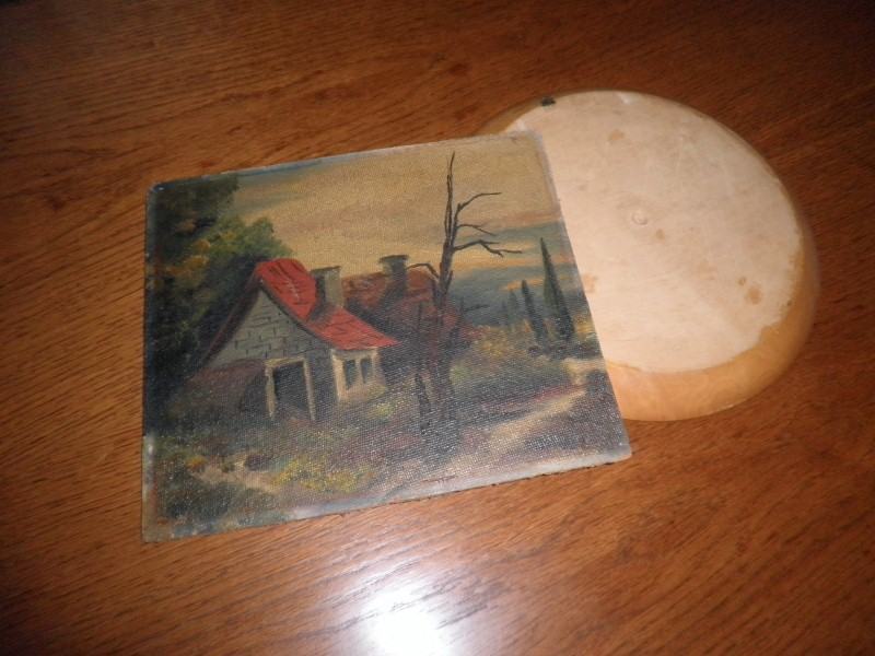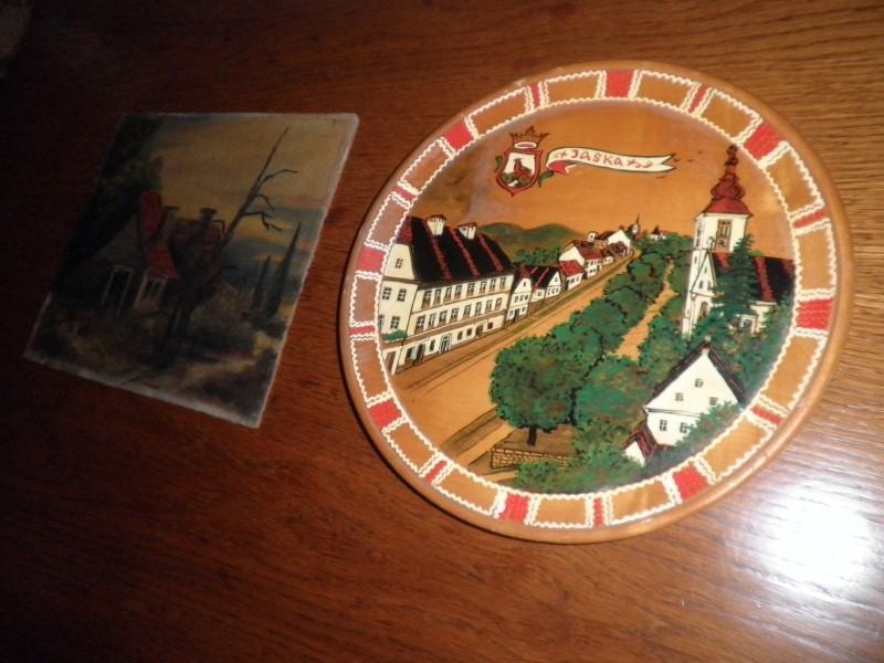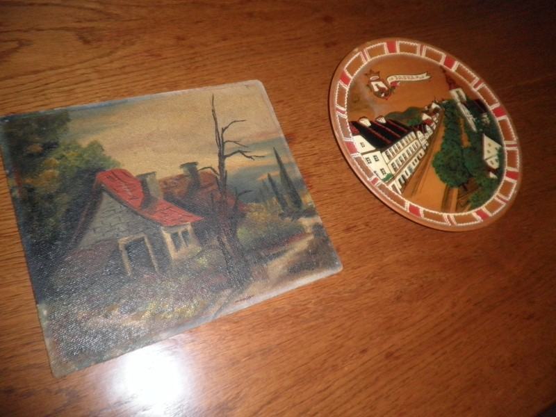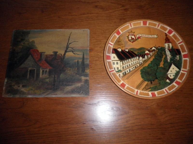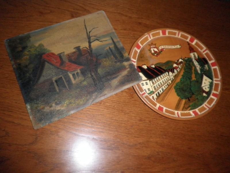 Dvije stare slike na lesonitu 30x26 cm i na drvenom tanjuru promjera 30 cm ...... obadvije za samo 100 kn !!
