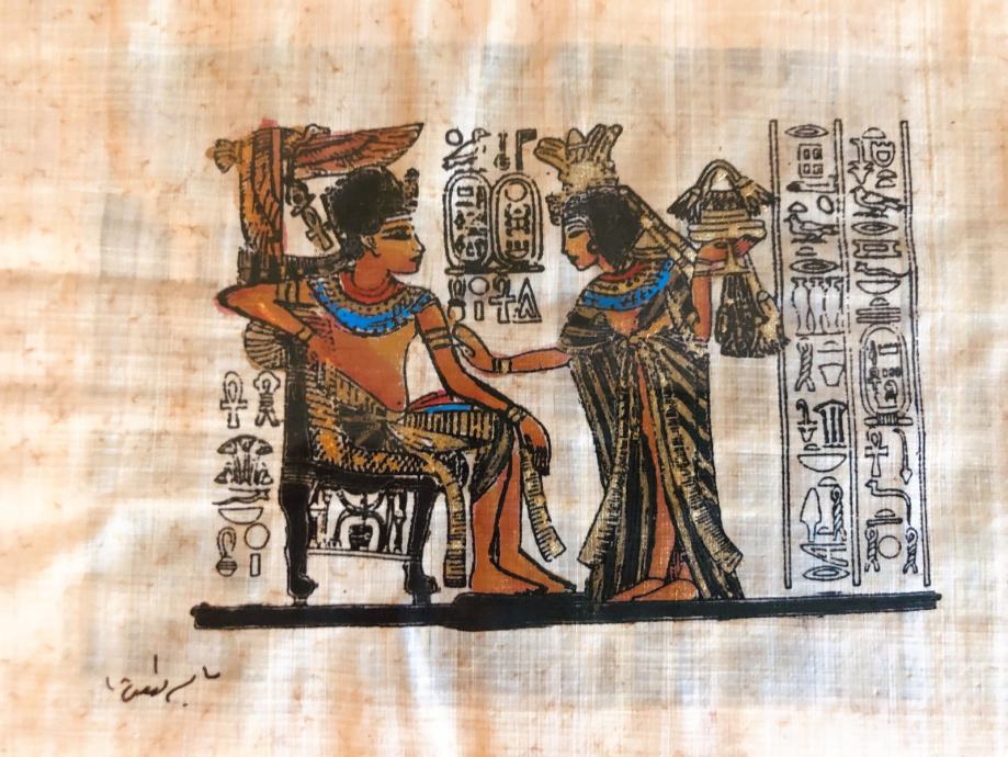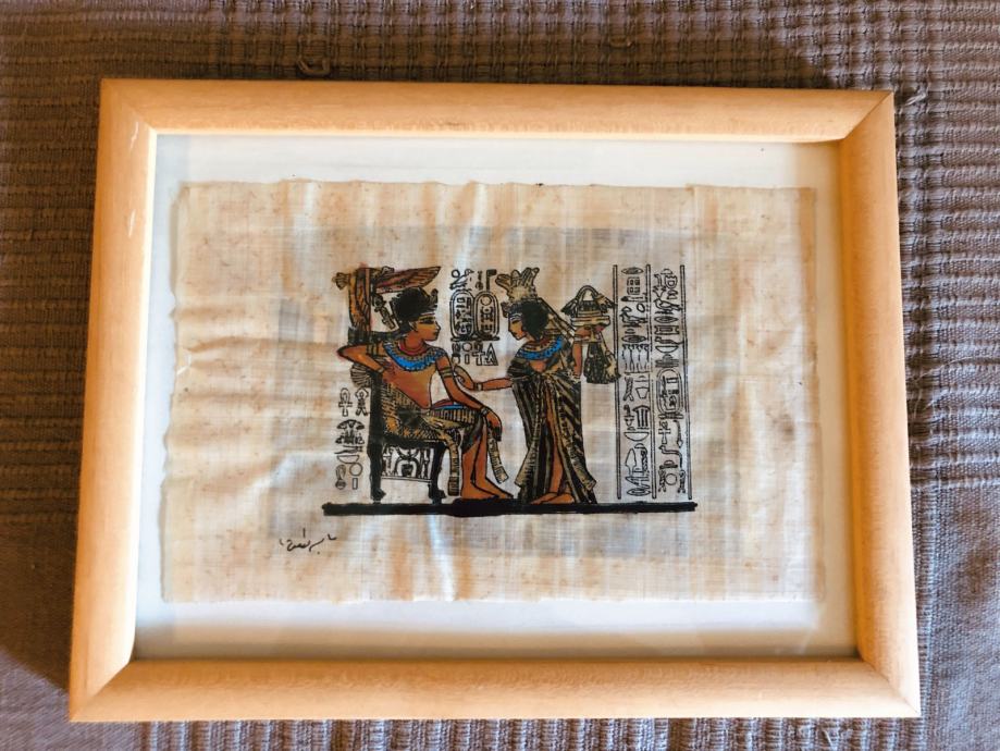 Kupljena u Egiptu u tvornici papirusa tako da je to pravi papirus. Dimenzije sa okvirom 22,5 x 7,2 cm