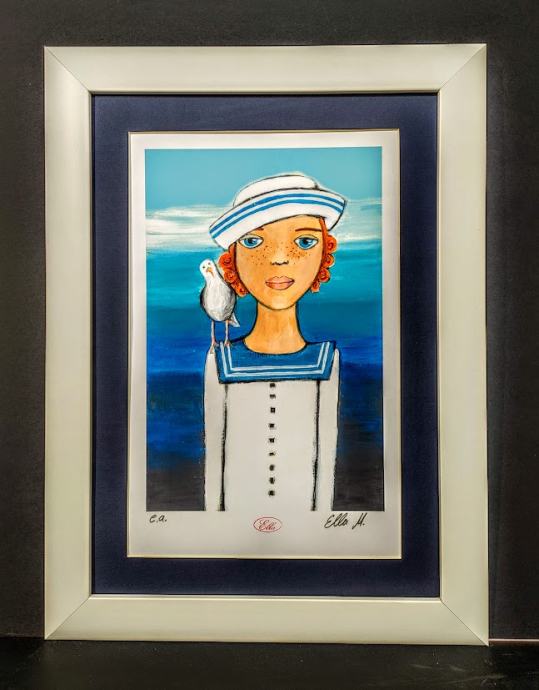 "Ella i galeb", grafika, uramljena, dimenzije s okvirom 40x54 cm.
