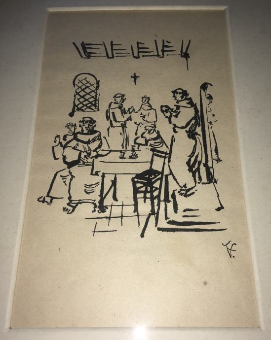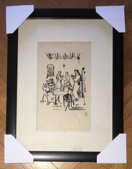 Fedor Vaić - crtež tušem čuvenog hrvatskog akademskog slikara. Galerijski novouokvireno i ostakljeno. Dimenzije s okvirom su 35x27cm (dimenzije unutar paspartua su cca 21x12cm). Prema mojim infomacijama, crtež je jedna od ilustracija za roman Bakonja fra Brne, no to nisam provjeravao. Cijena je fiksna.
