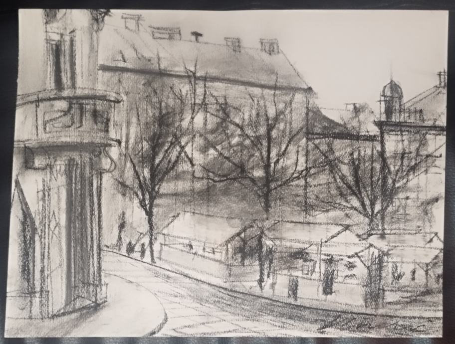 Akademski slikar. Naziv slike - Britanski trg. Ugljen/pastel, dimenzije 50x35cm