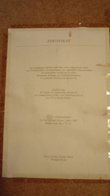 Prodaje se slika od Friedensreich Hundertwasser, naziv "Löwengasse". Proizvedena u Granolitho postupku u 10 boja s dodatnim tiskom zlatne i srebrene folije. U ograničenom broju 839/2000, dimenzije 80 cm * 70 cm. Uz sliku ide certifikat.