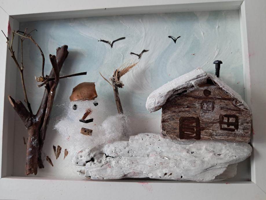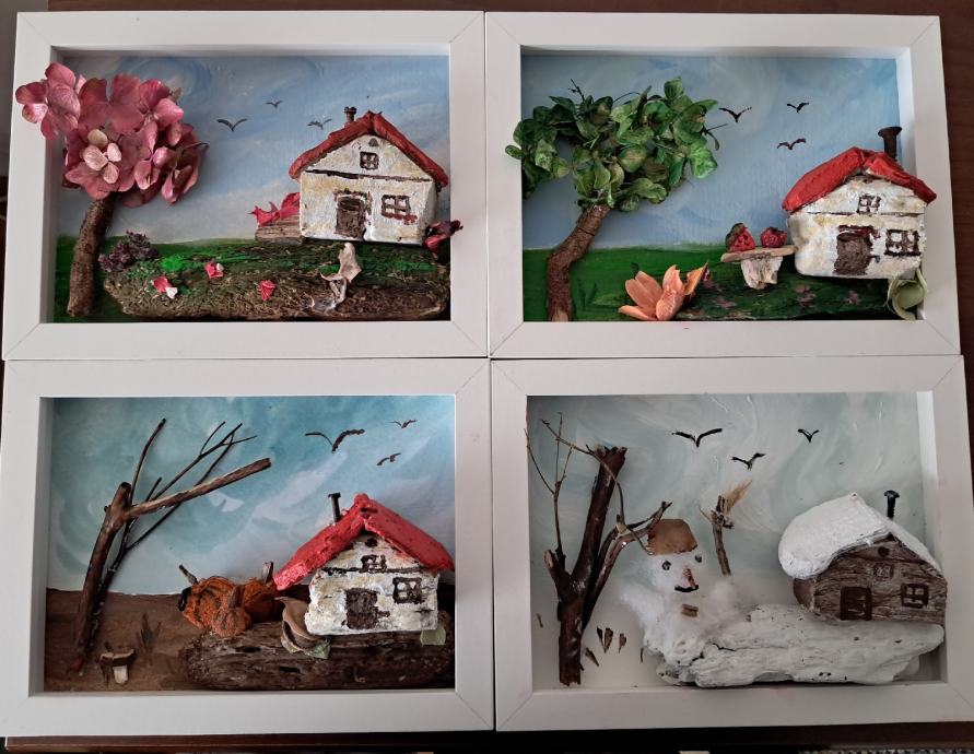 Ove 4 slike, godišnja doba, izrađene su od morskih naplavina, obojane, i uz dodatak mašte pretvorene u unikatni ukras svakog doma.Dimenzije pojedinačne slike su 15×20cm.Cijena svih slika je 80 eura,20 eura svaka.