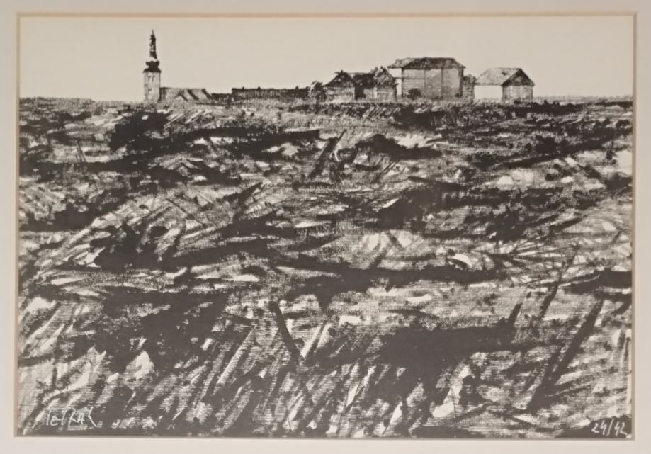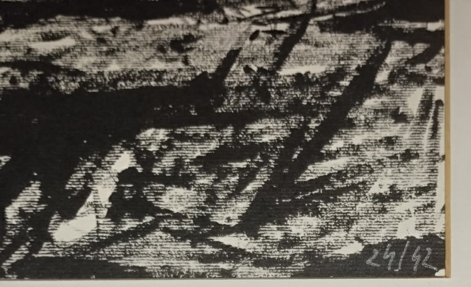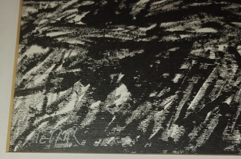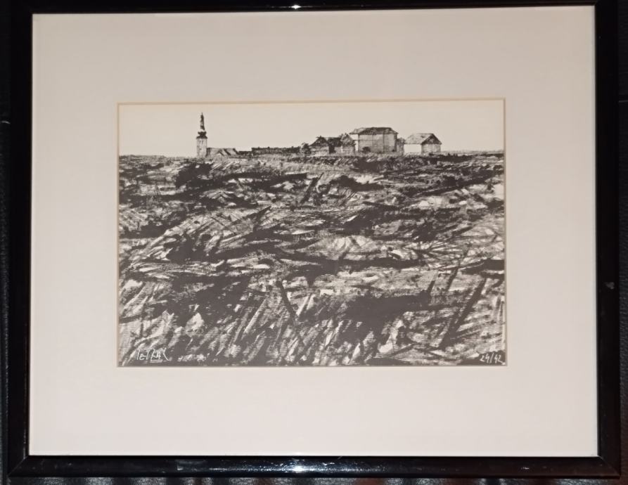 Potpisana grafika hrvatskog akademskog slikara. Galerijska rama sa staklom. Dimenzije 38x31cm (sama slika 24x17cm).