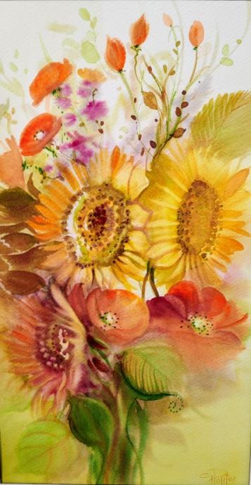 "Suncokreti", akvarel, Goranka Politeo, uramljen, novi okvir, dimenzije s okvirom 43x51 cm.