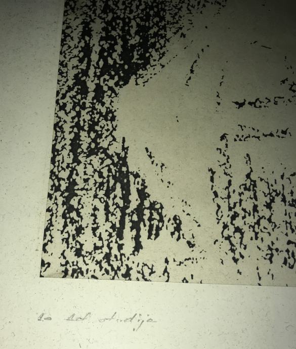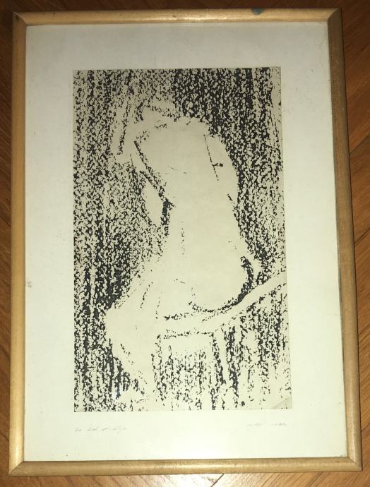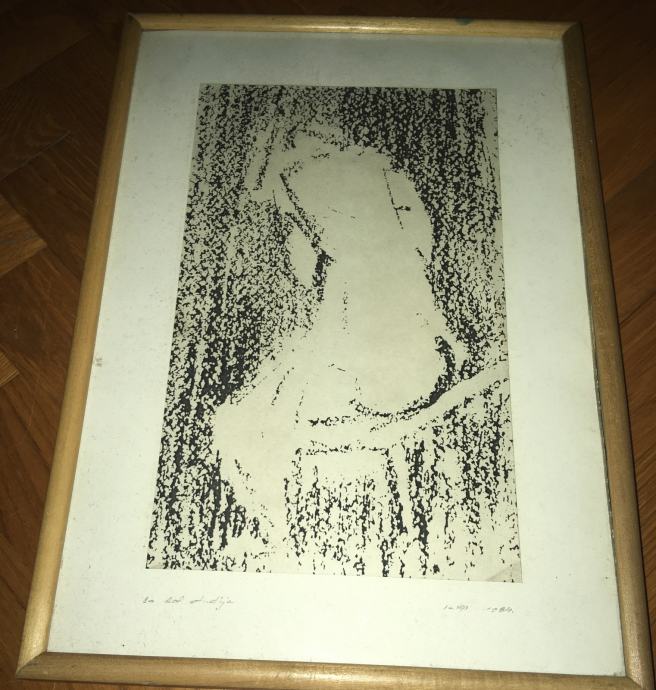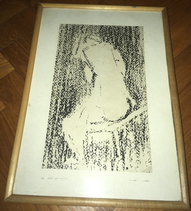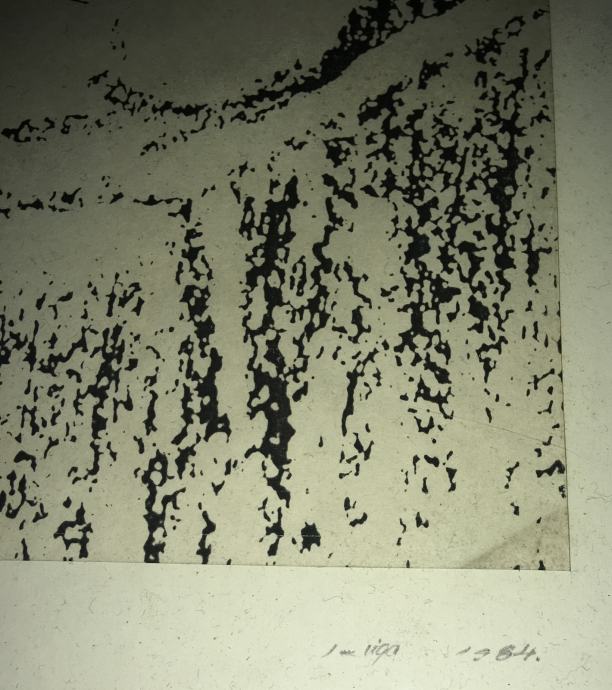Potpisana grafika iz 1984.g. meni nepoznatog autora. Potpis vidljiv na fotografijama. Uz godinu piše još i "Lo. def. studija". Uokvireno i ostakljeno. Dimenzije s okvirom su 37x27cm.