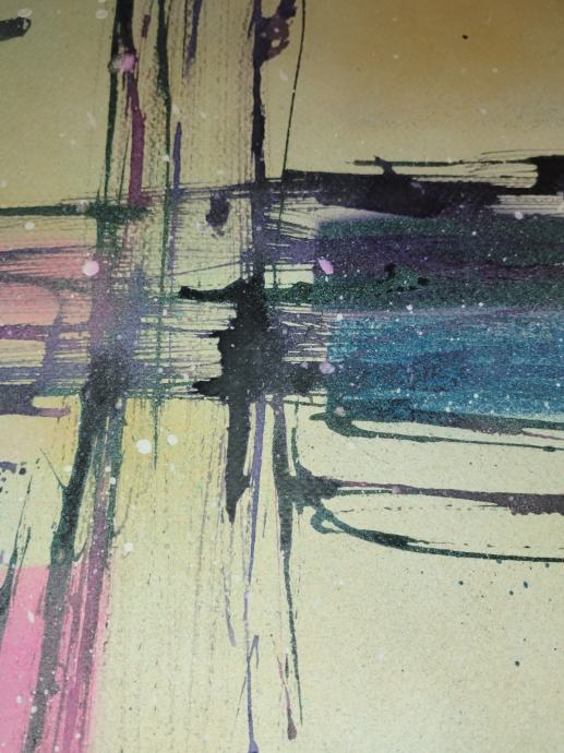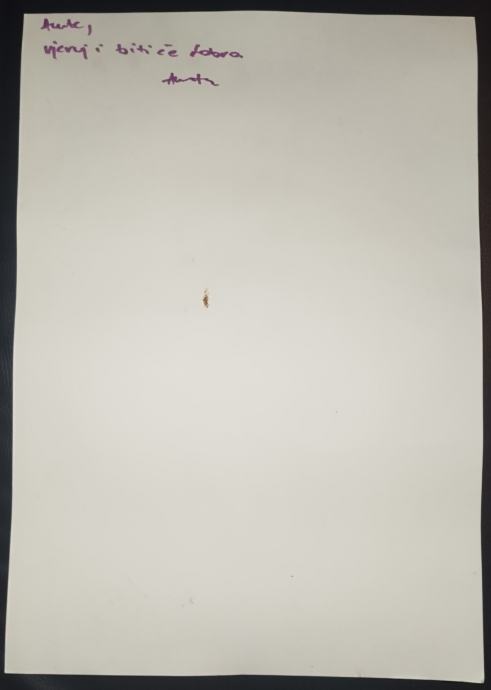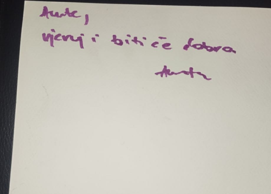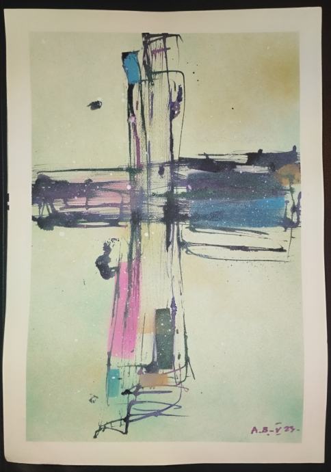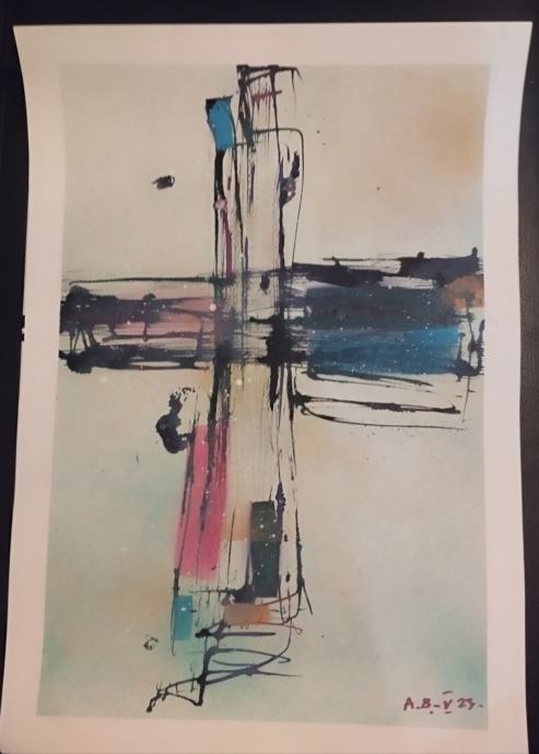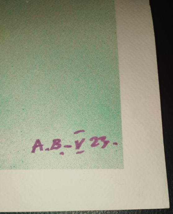 Bojom dorađena grafika nepoznatog autora (potpis A. B.). Posveta na stražnjoj strani. Dimenzije 50x35cm.