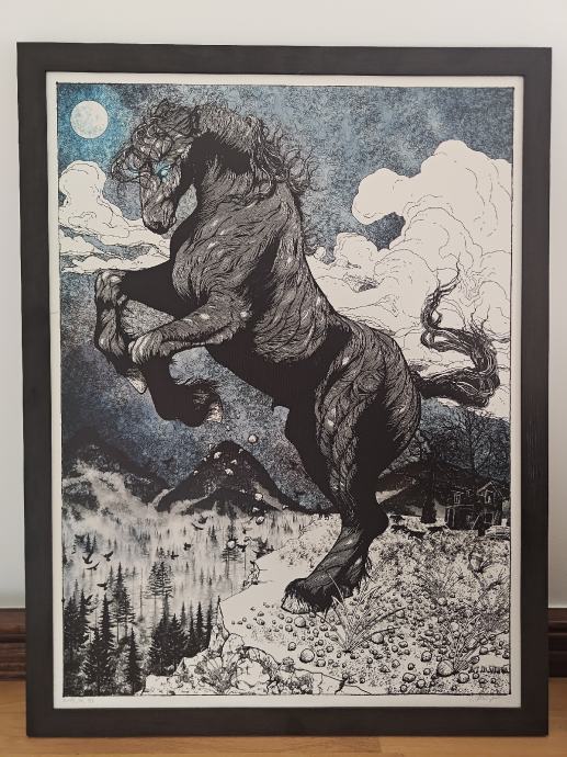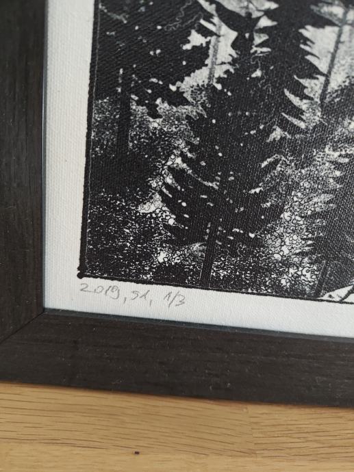 Grafika otisnuta 2019 godine u veličini s okvirom 73 X 96 cm, drveni okvir debljine 3.5 cm. Jedan ovjes na stražnjoj strani, vrlo lagan predmet i u odličnom stanju bez ikakvih oštećenja.
