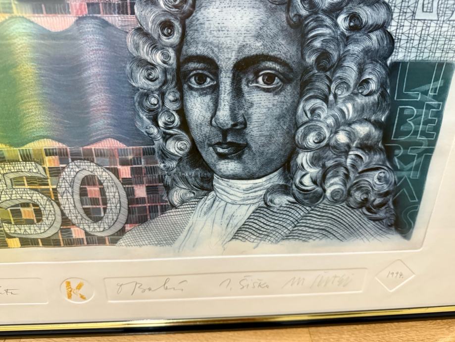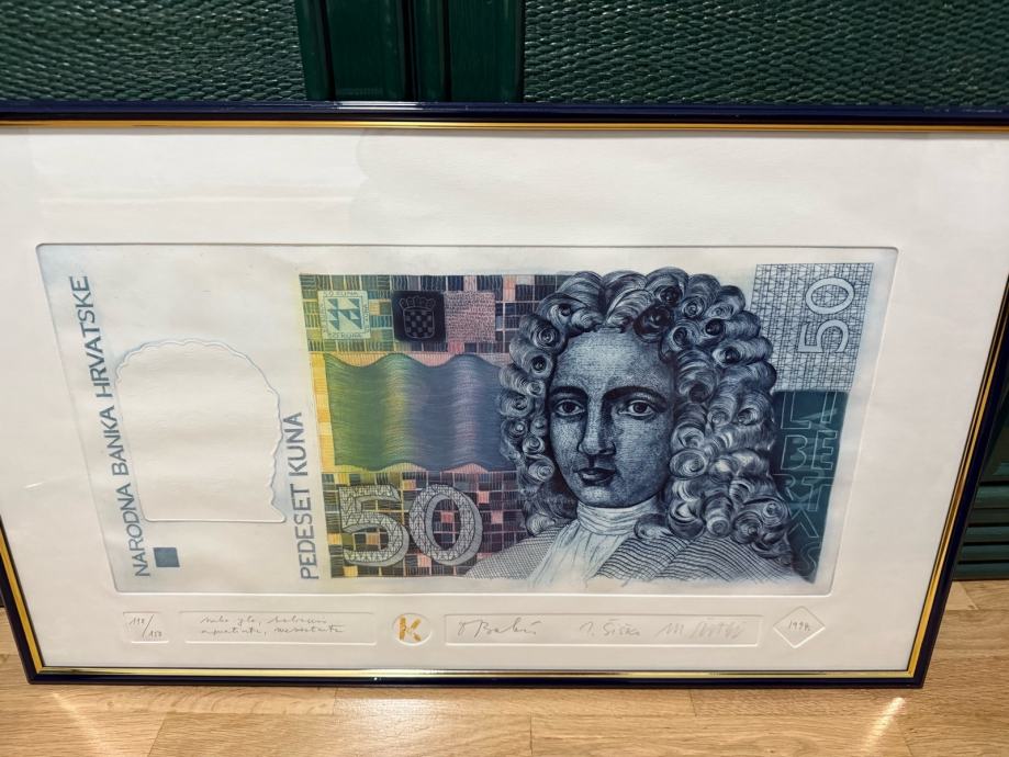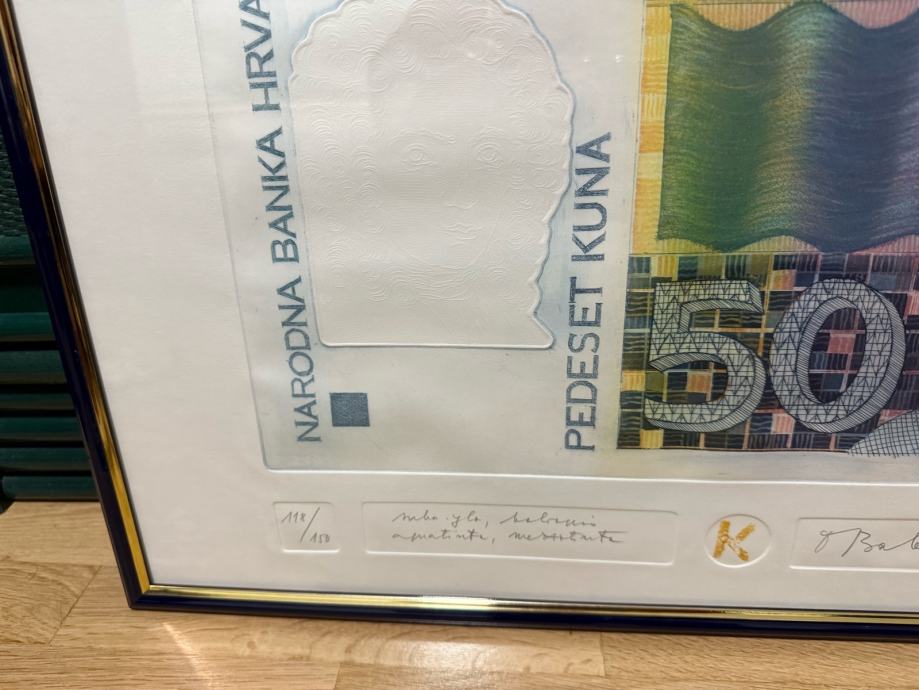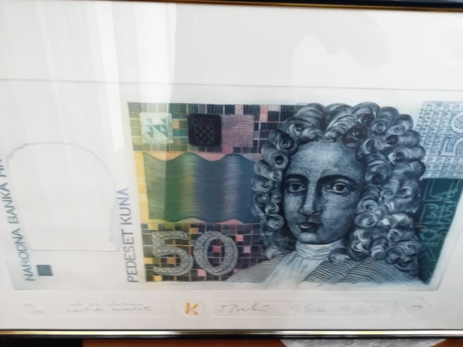 Originalna grafika novčanice 50 kn, uokvirena, dimenzije 73x47mm, autori Dubravka Babić, Ivica Šiško, Miroslav Šutej
