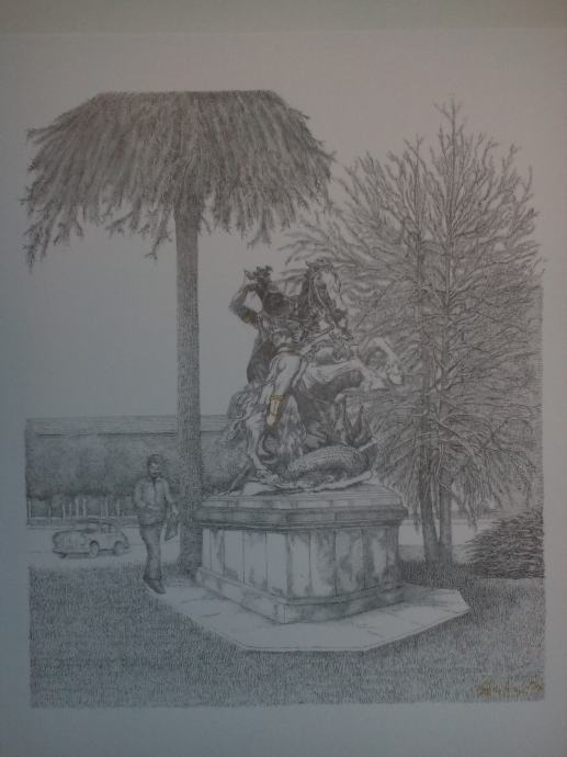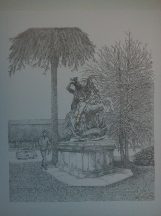 Potpisana grafika "Sveti Juraj ubija zmaja", nepoznatog autora iz ciklusa "Zagrebačke vedute '91- '97".