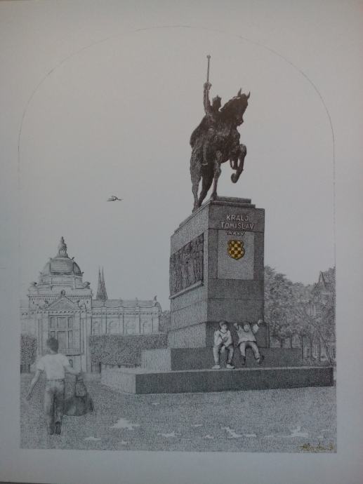 Potpisana grafika Tomislavov trg, nepoznatog autora iz ciklusa "zagrebačke vedute '91- '97".