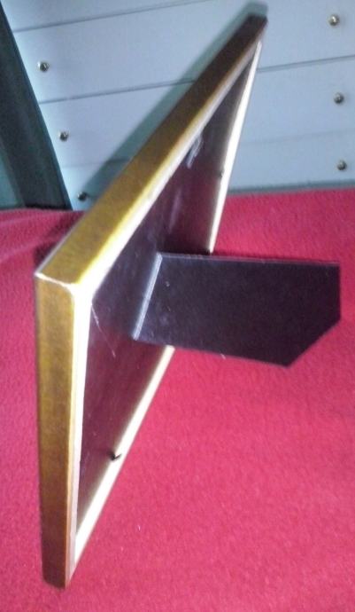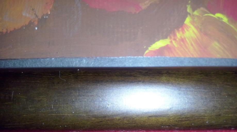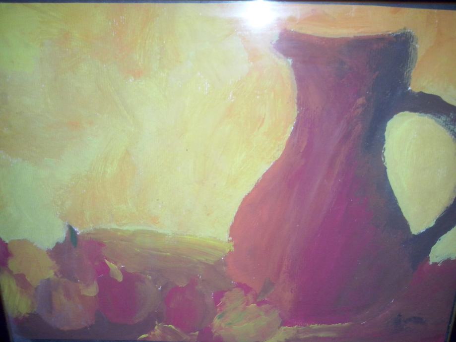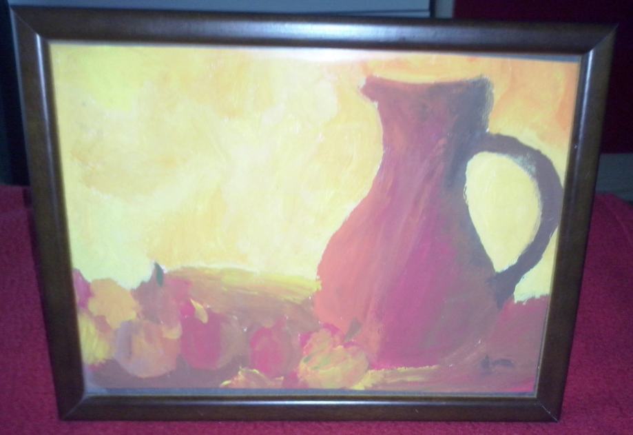 Gvaš, rad osnovnoškolaca. Uramljena. Tamnosmeđi drveni okvir. Nastavak za stavljanje na stol. Dimenzije 26x20 cm.