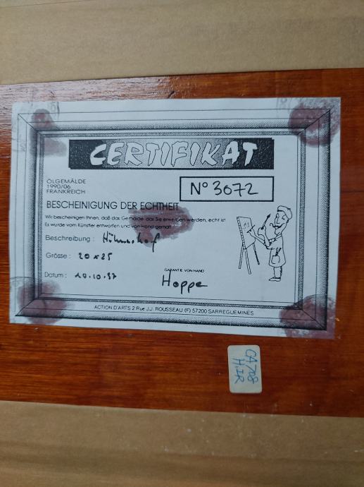 Na poleđini se nalazi originalni certifikat iz 1979. (br. 3072) s potvrdom autentičnosti.