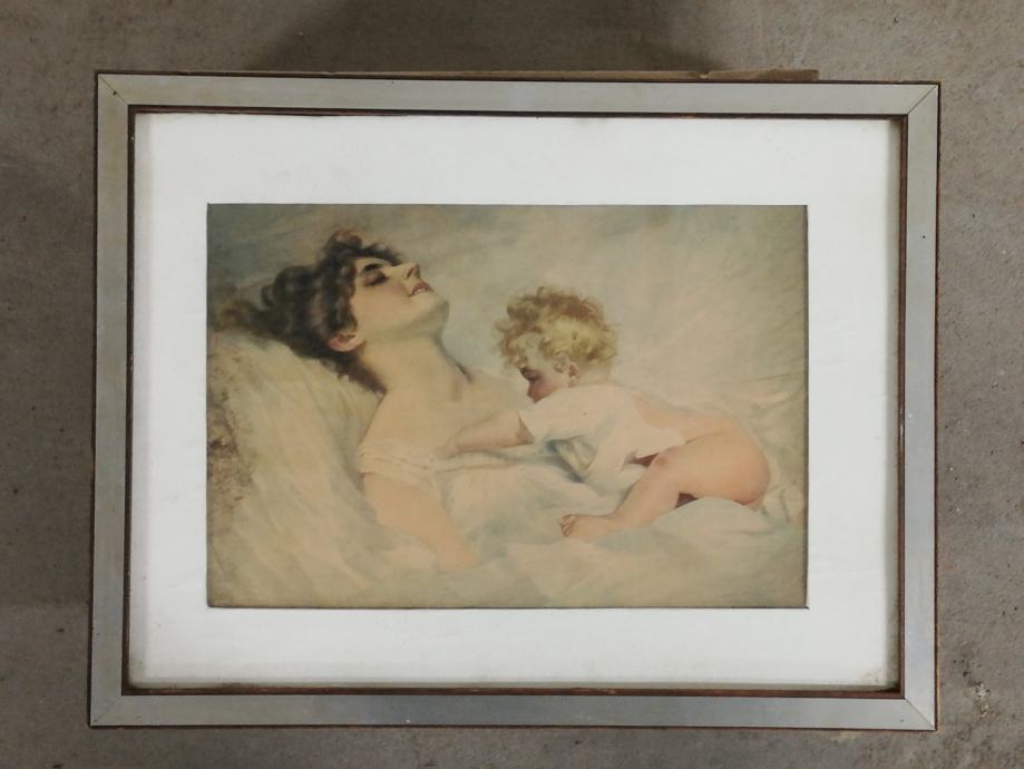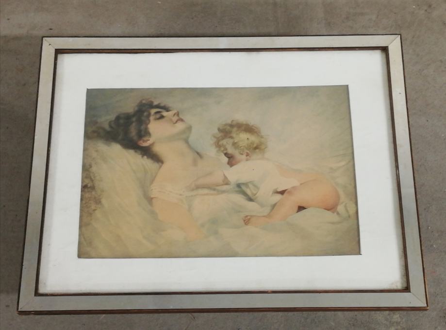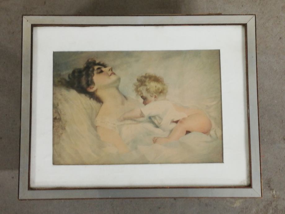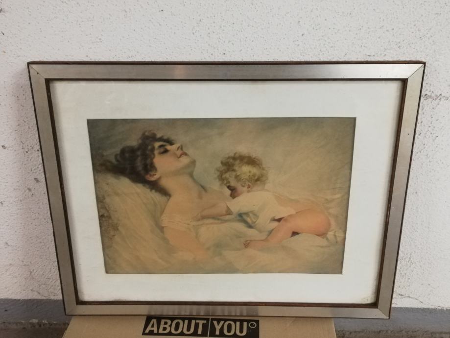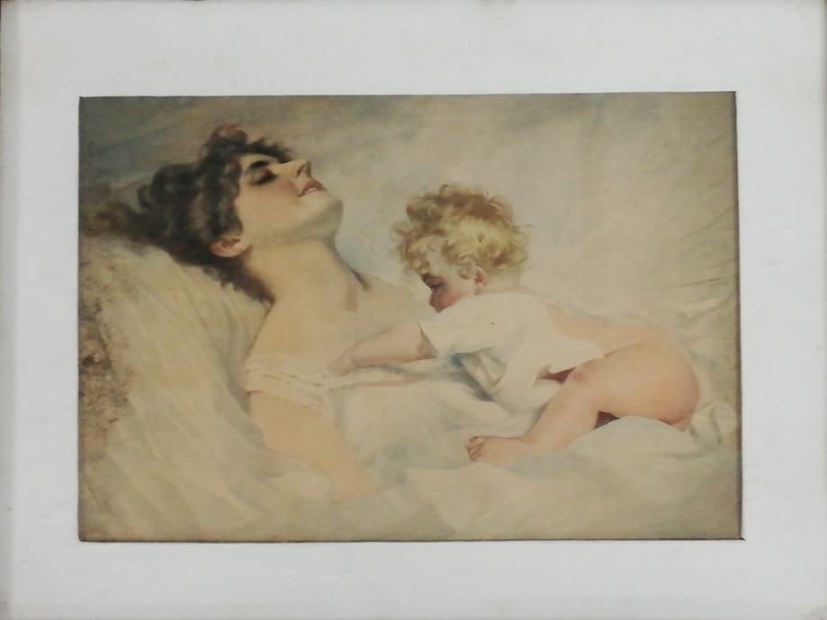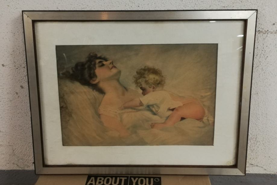 Uokviren akvarel, nepoznatog autora, na temu umjetničke slike Hermanna Halbweisa (Maiersdorf 1896-1978 Linz) pod nazivom Majčina sreća. Dimenzije : 52,5 x 40,2 cm, sama slika 37 x 25 cm. Širina okvira 2,4 cm. Širina paspatua 5,5 cm, debljina okvira 1, 6 cm.