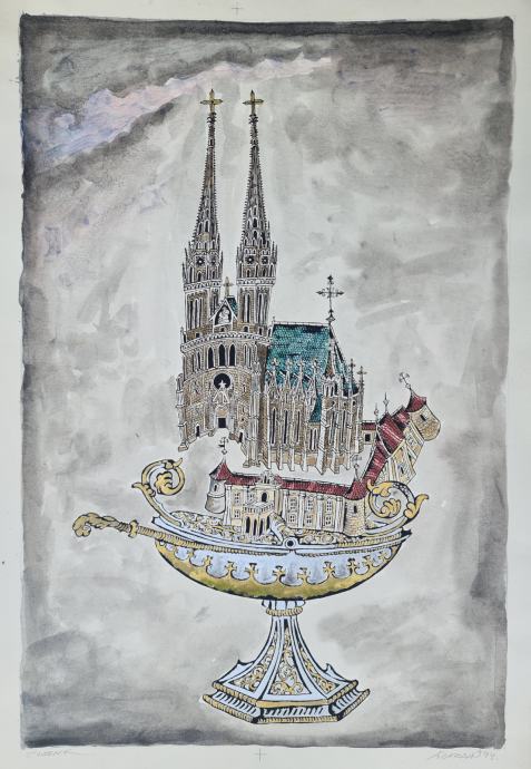 Hrvoje Šercar "Zagrebačka Katedrala" tempera / tuš 70x50cm;iz 1994 god