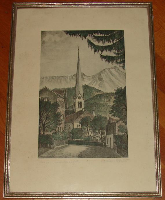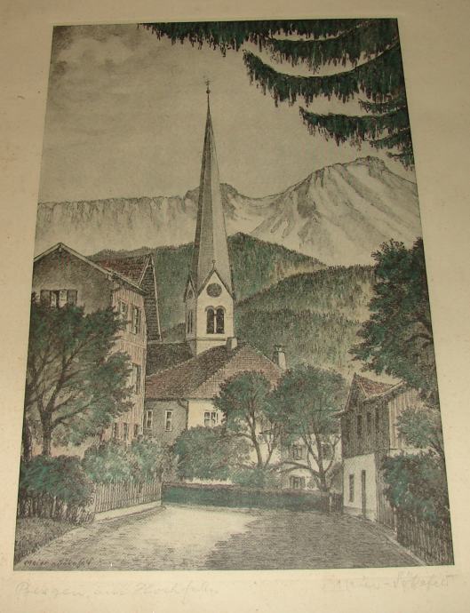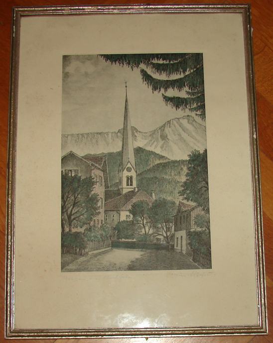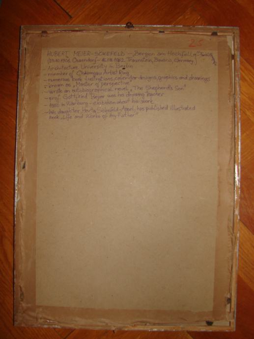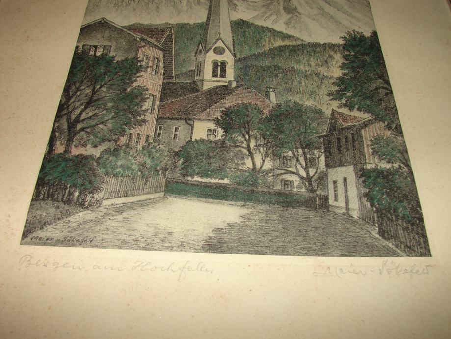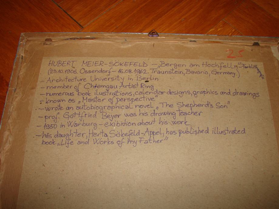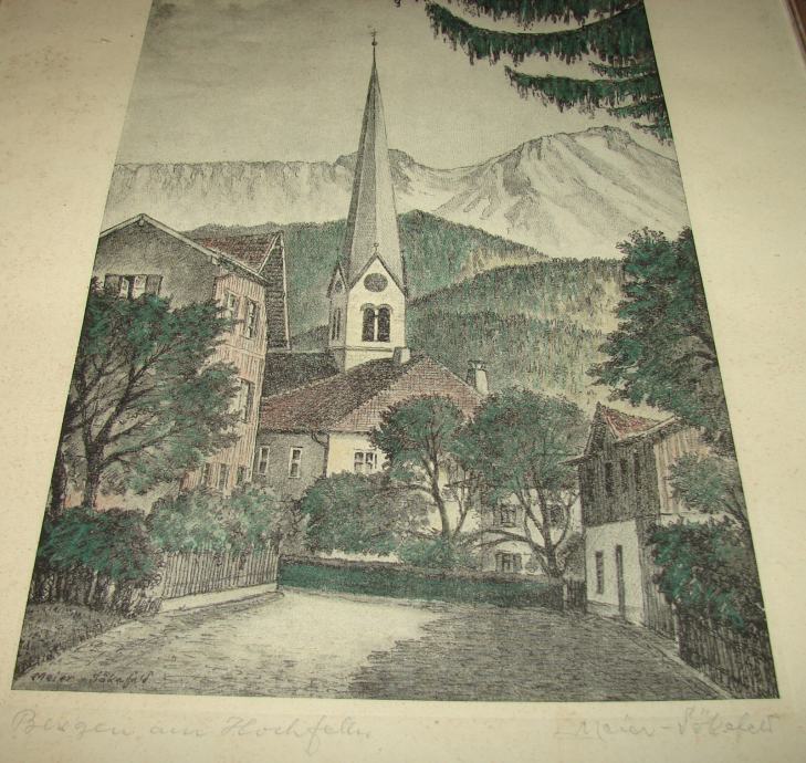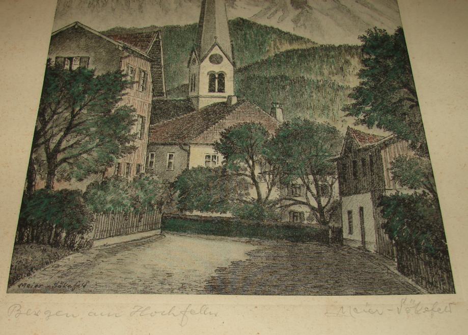 Olovkom potpsani bakrotisak / litografija u boji poznatog njemačkog slikara, grafičara i arhitekta Huberta Meiera-Sökefelda. Uokvireno u okvir iz vremena i ostakljeno. Naziv slike je “Bergen am Hochfelln”. Dimenzije s okvirom su 43x31cm.