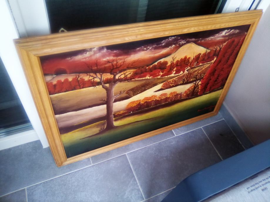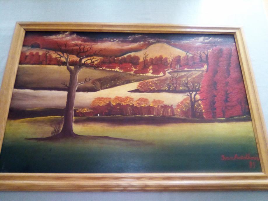 Prodajem uramljenu sliku kipara-slikara Ivana Antolkovića iz 1985. godine. Slika je original (ulje na lesonitu), prikazuje pejzaž u duhu naive kojim dominira crvena boja.