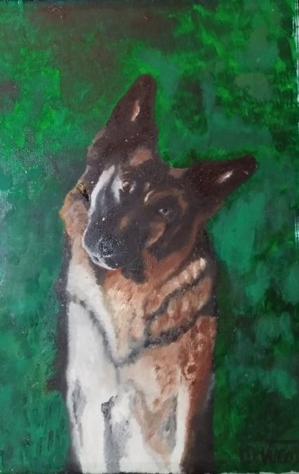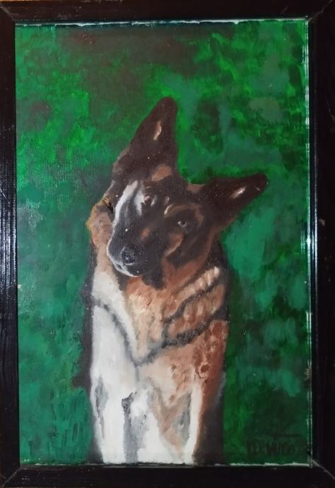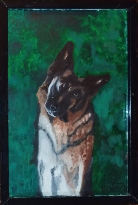Akril na platnu akademskog slikara. Uokvireno, ostakljeni. Motiv je njemački ovčar. Dimenzije ukupno 49x34cm.