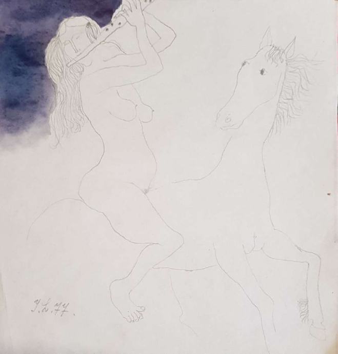 Ivan Lovrenčić "Djevojka i konj" crtež / tempera 23x23cm; iz 1977. g