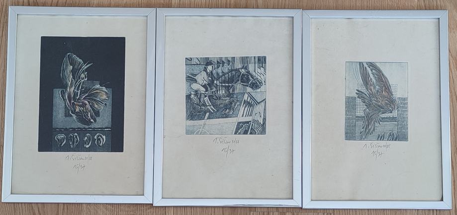 Prodajem tri slike autora Ivice Šiška, rađene u maloj nakladi u tehnici bakropisa i suhe igle. Veličina okvira 37x27 cm.