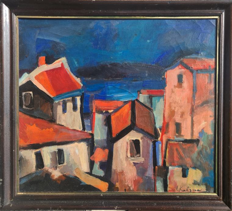 Ivo Kalina "Kuće uz more" ulje na platnu 53x63 cm; oko 1960 godine;