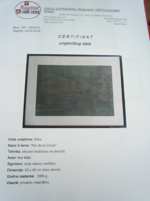 35x45, sa orginalnim okvirom autora 42,6x56,5 i orginalnom naljepnicom, Rio de la Croce, certifikat o autentičnosti djela, samo osobno preuzimanje