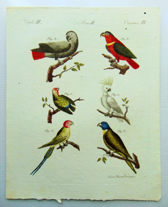 Motiv su papige,sest razlicith vrsta.Rucno bojana,originalne boje.