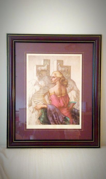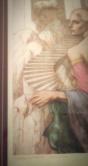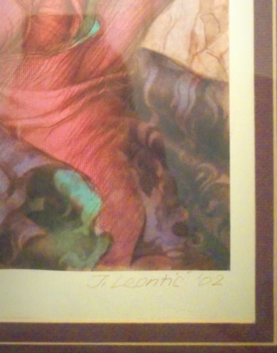 Umjetnička slika pok. slikarice Jasenke Leontić, kombinirana tehnika, vel. slike 32x40 cm, a okvira 55x65cm.