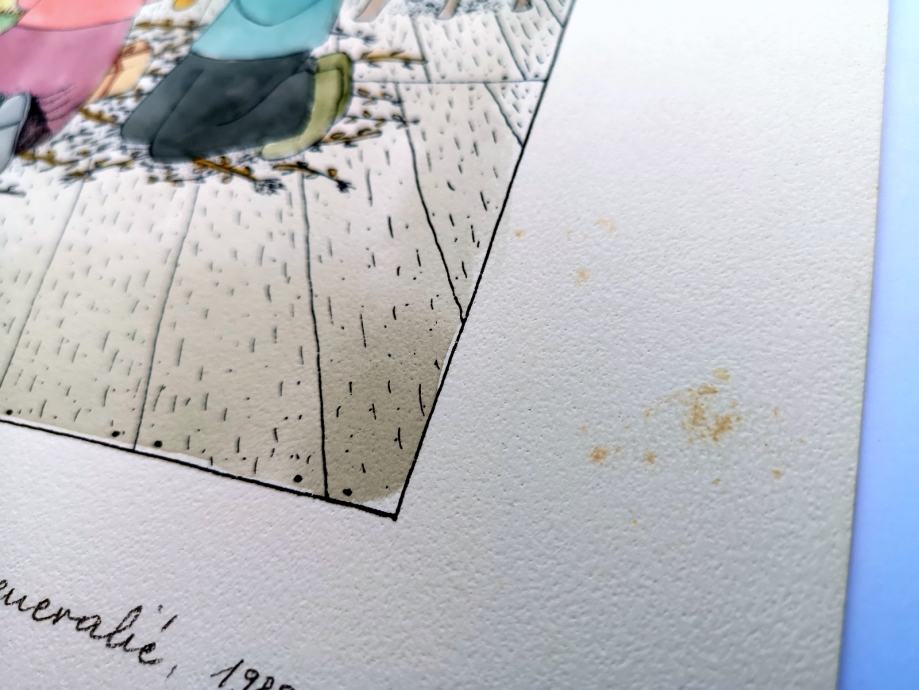 Grafika na gornjoj strani papira ima neizbrisiv, osušeni trag selotejpa ili slične ljepljive trake. Žuta flekica je i na donjoj, desnoj strani.