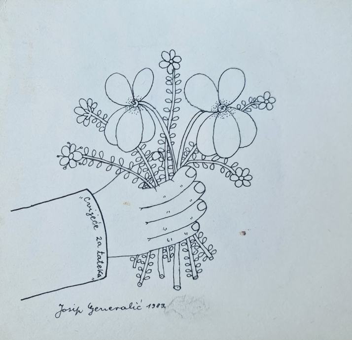 Josip Generalić "Cvijeće za tateka" crtež tušem 20x20cm; iz 1989 god