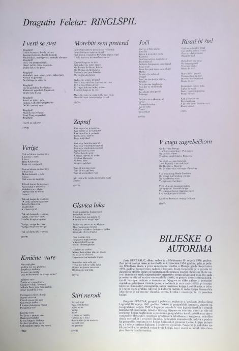 Mapa nosi naziv Ringlšpil, a izašla je u 100 primjeraka i po svemu sudeći već vrlo brzo, s obzirom na mali broj primjeraka, njezina vrijednost bit će podvostručena. U ovoj unikatnoj mapi Dragutin Feletar objavio je deset pjesama (I verti se svet, Verige, Kmične vure, Morebiti sem preteral, Zapraf, Glavica luka, Štiri nerodi, Joči, Risati bi štel, V cugu zagrebačkom), koje su zapravo na neki način izbor ponajboljih njegovih pjesama dosad objavljenih u tri samostalne zbirke. Na posebnim papirima većeg formata ove je pjesme ilustrirao na majstorski način Josip Generalić, što zajedno sve čini jednu sukladnu, krasnu umjetničku tvorevinu.