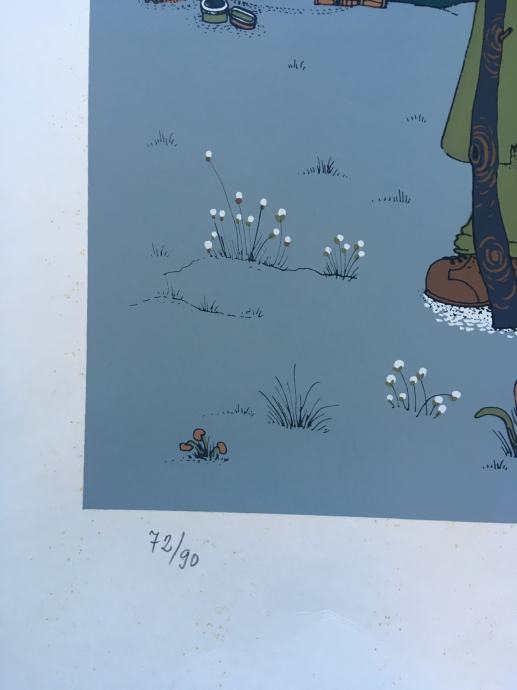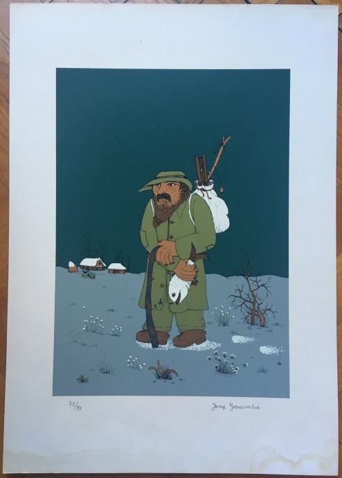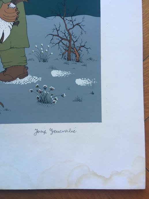 Potpisana i numerirana grafika čuvenog hrvatskog slikara naive, Josipa Generalića. Kvalitetan sitotisak. Dimenzije su 50x35cm. Mrlje od vlage da donjem dijelu lista gragike lako je prekriti paspartuom.