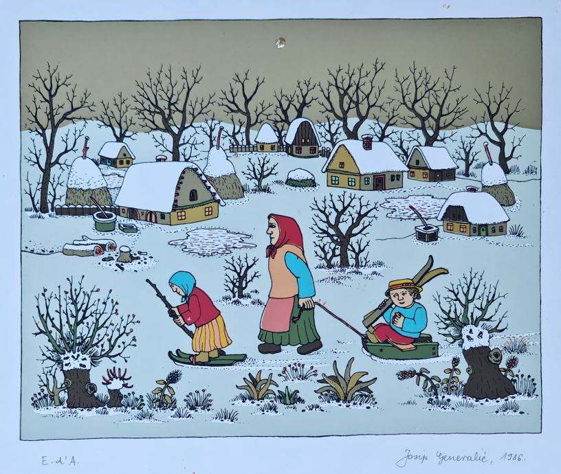 Josip Generalić "Sanjaknje na snijegu" svilotisak serigrafija 35x50cm; iz 1986. godine;
