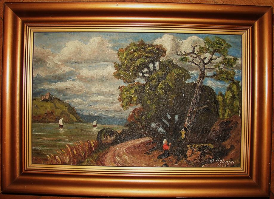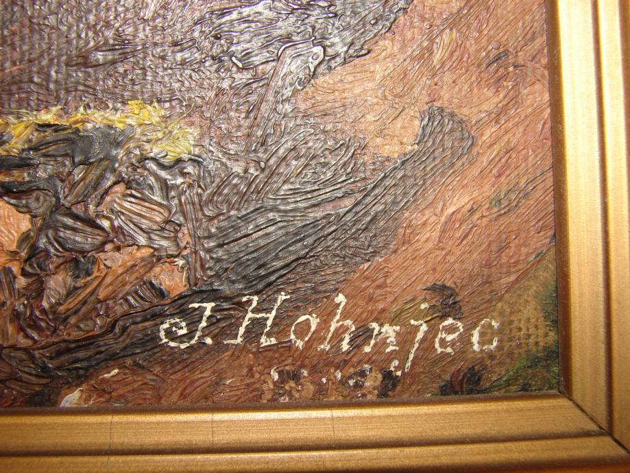 Josip Hohnjec – Ulje na lesonitu, dimenzije 37,5x24,5cm (sa okvirom 45,5x32,5cm). Hrvatski slikar i likovni pedagog (Plavić kraj Klanjca, 1. XI. 1857 – Bjelovar, 9. II. 1939). Studirao na Akademiji u Beču. U duhu akademskoga realizma slikao povijesne prizore i portrete (serija portreta bjelovarsko-križevačkih župana, 1891–97); u sakralnim kompozicijama i krajolicima bliži je romantizmu. Restaurirao slike i oslikavao interijere (alegorija 4 Godišnja doba na stropu ljekarne Werklein u Bjelovaru, 1905., kuće građene prema projektu Hermana Bolléa). Izradio je i idejno rješenje te crtež povijesnog grba Bjelovarske županije, kao i njegov oslik na zastavi. Kao zanimljivost se može istaknuti da je upravo Josip Hohnjec, tadašnji profesor risanja na Kraljevskoj maloj realnoj gimnaziji („kraljevski profesor, čuvar risarske zbirke i zaprisegnuti sudbeni vještak u pismu“) izvršio najznačajniji utjecaj na odabir životnog poziva svoje najdarovitije učenice, Naste Rojc, jedne od prvih hrvatskih akademski školovanih slikarica.