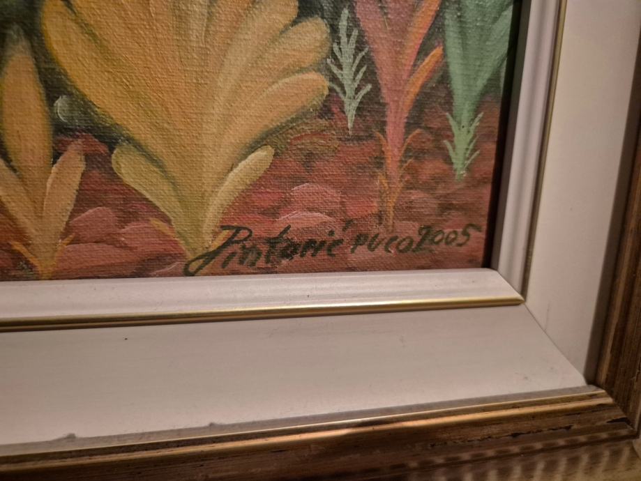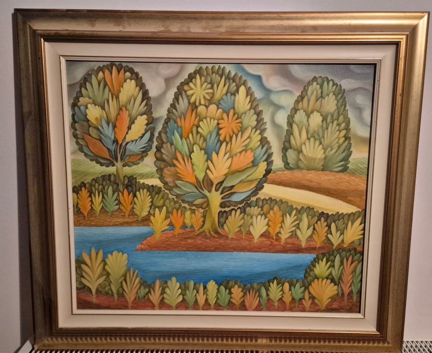 Rad prepoznatljivog autorova rukopisa hrvatske naive, s motivom bujne vegetacije i vode, snažnog kolorita i dekorativnog izraza.