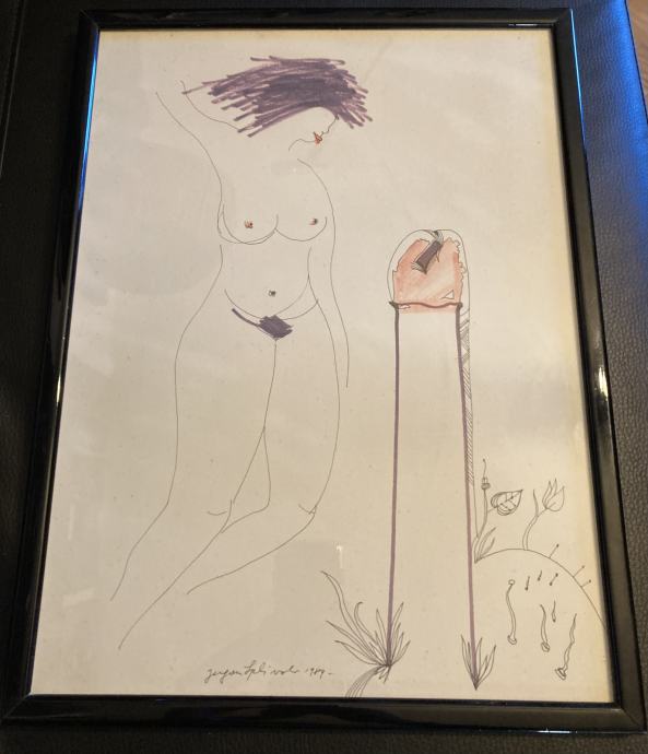 Crtež tuš/flomaster iz 1989.g. poznatog hrvatskog slikara, Jugana Splivala, iz njegovog erotskog ciklusa. Uramljeno i ostakljeno. Dimenzije su 41x31cm.